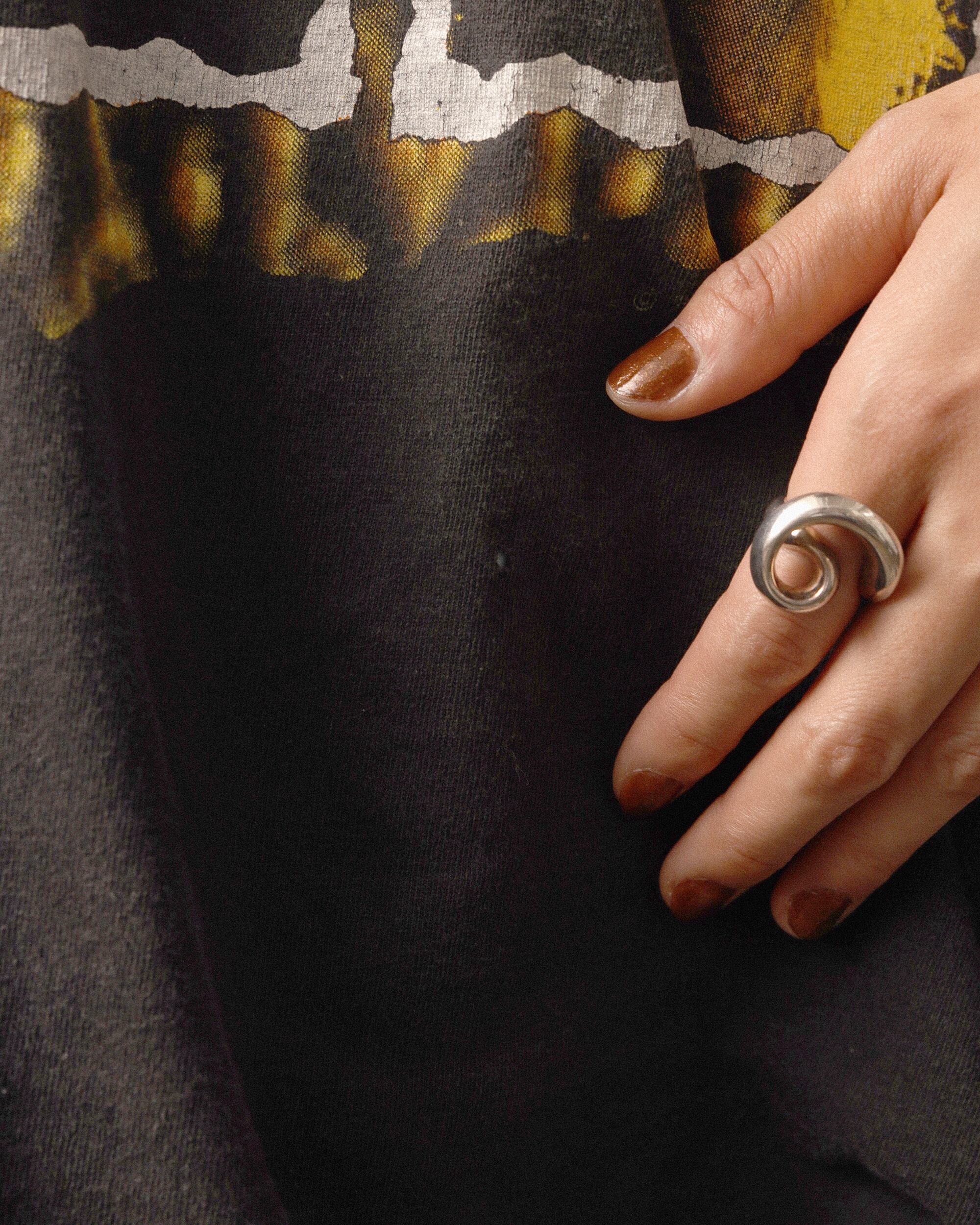 Era : c. 1990 Label : Missing / Made in —- Materials : おそらくCotton, Poly Condition : 腹部に, 首元にキズ Color : Faded Black Size : 肩幅56cm / 身幅57cm / 着丈68cm / 袖丈19cm *採寸は平置きで採寸しております。多少の誤差は御了承下さい。 Model:163cm Care : 手洗い, 洗濯機クリーニングモード