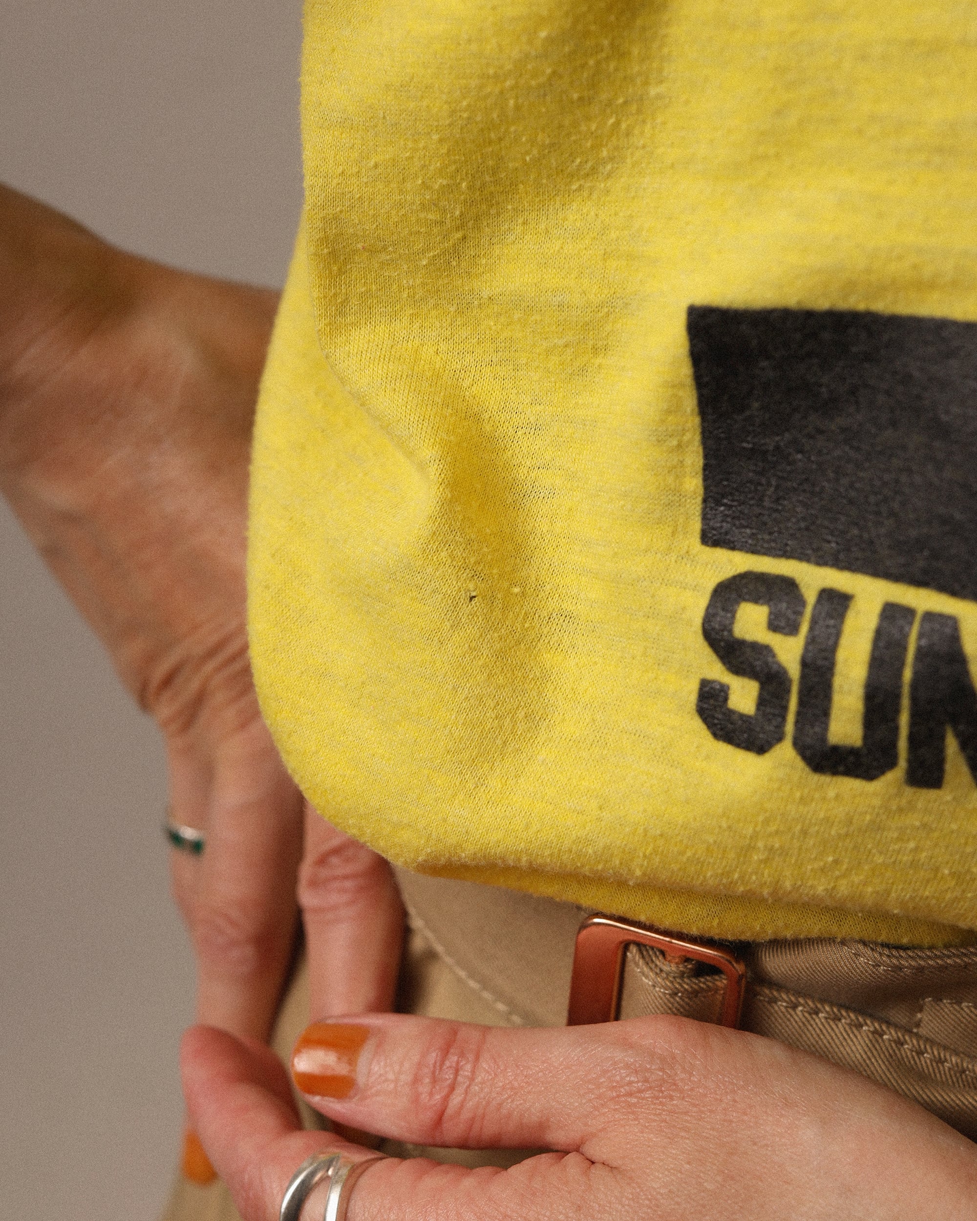 Era : c. 1980 Label : Screen Stars / Made in USA Materials : Cotton, Poly Condition : 胸元にピンホール Color : Faded Yellow Size : 肩幅37cm / 身幅43cm / 着丈60cm / 袖丈17cm *採寸は平置きで採寸しております。多少の誤差は御了承下さい。 Model:156cm Care : 手洗い, 洗濯機クリーニングモード