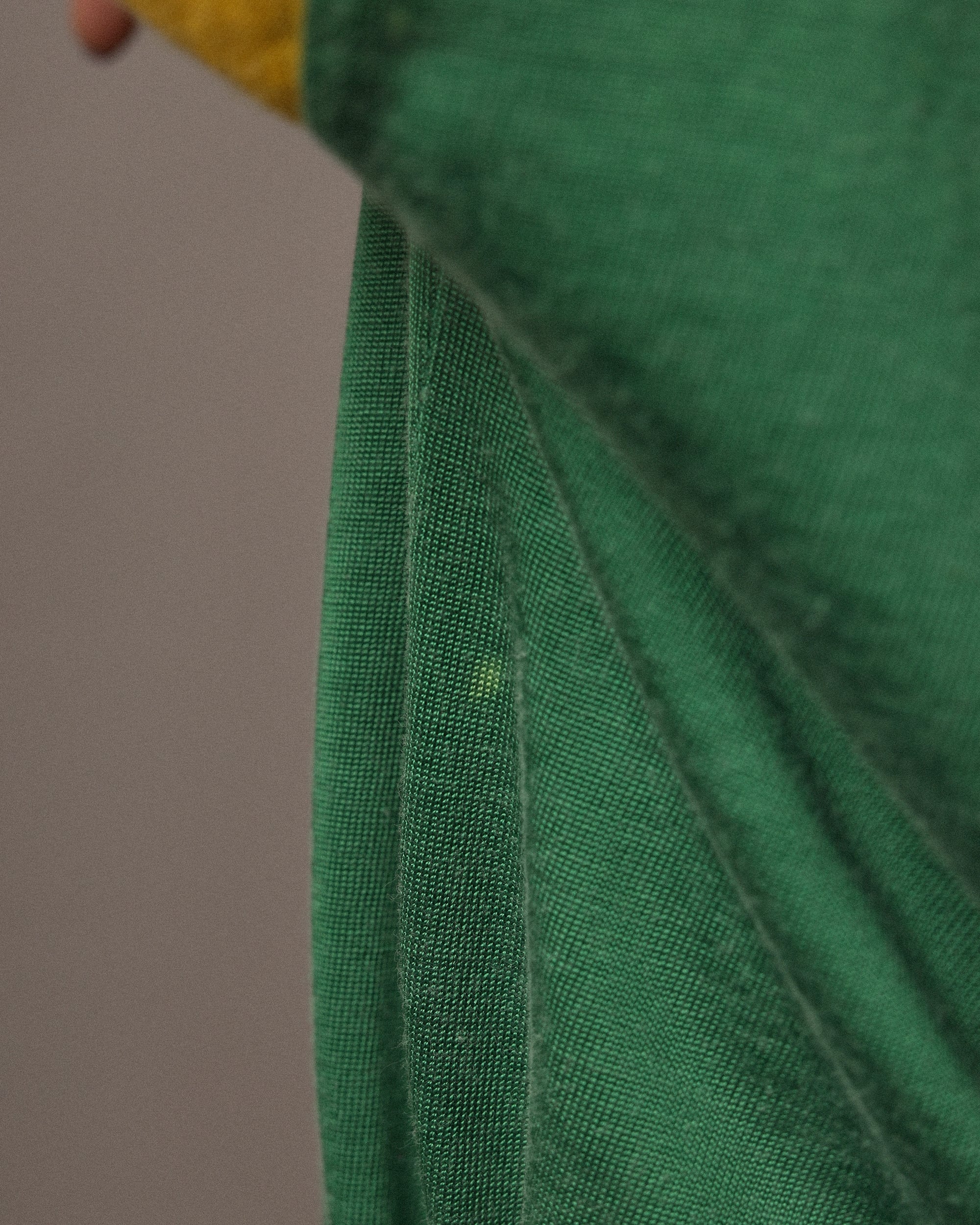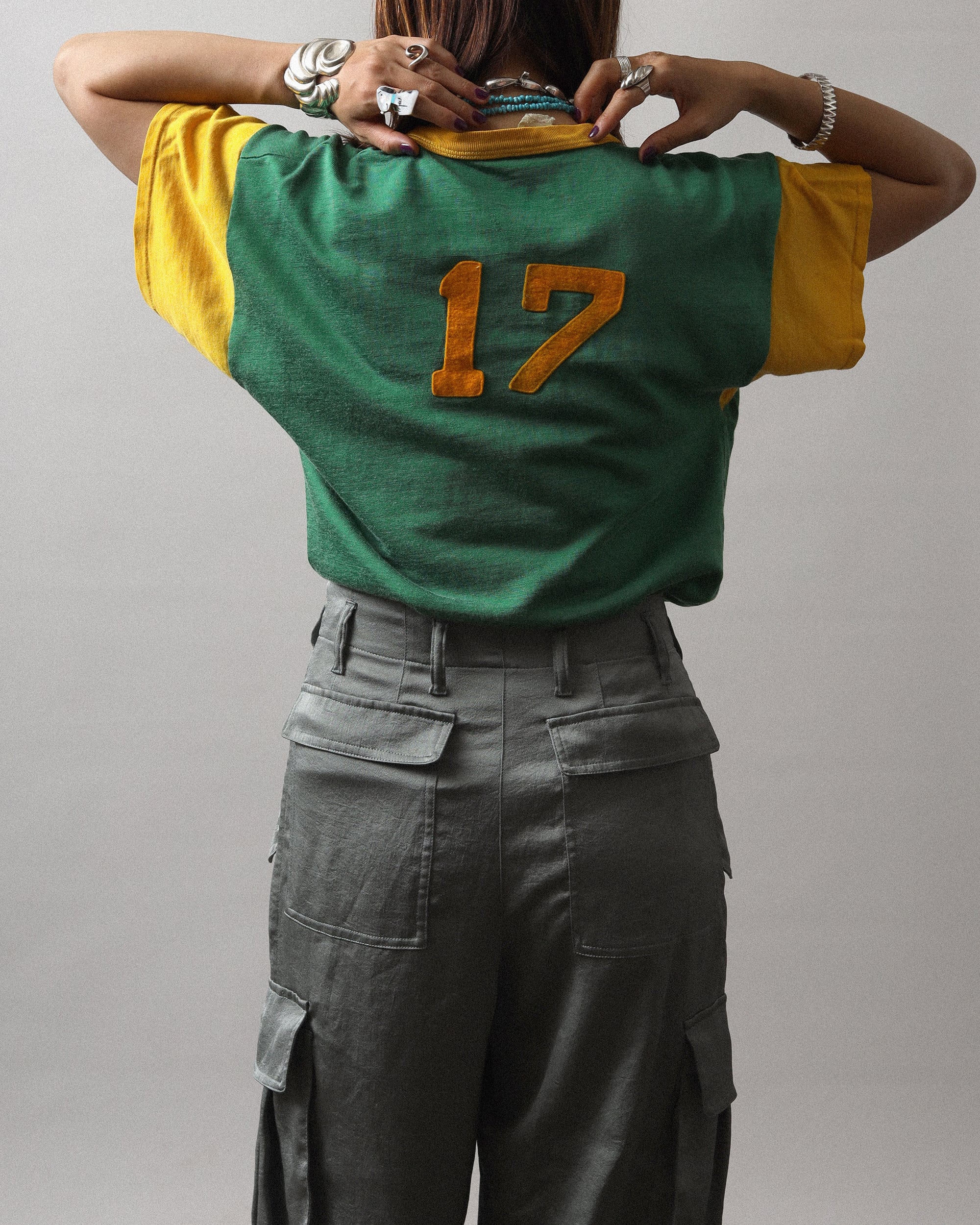 Era : c. 1960 Label : Empire / Made in USA Materials : Cotton, Rayon Condition : 右袖キズ, 右脇色ヌケ Color : Faded Green, Yellow Size : 肩幅50cm / 身幅50cm / 着丈63cm / 袖丈11cm *採寸は平置きで採寸しております。多少の誤差は御了承下さい。 Model:163cm Care : 手洗い, 洗濯機クリーニングモード