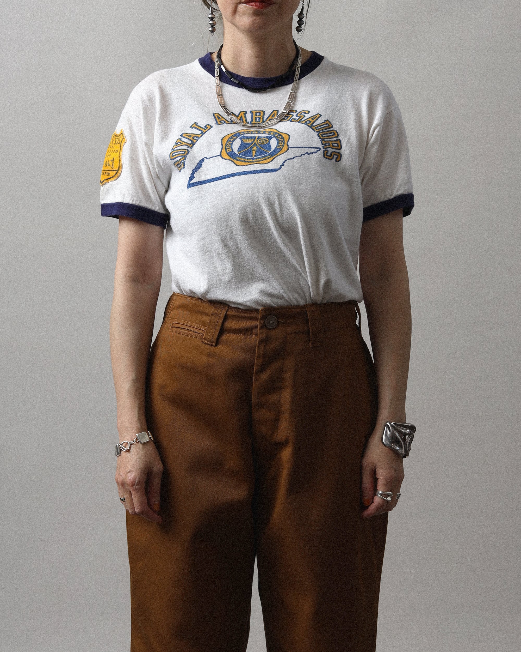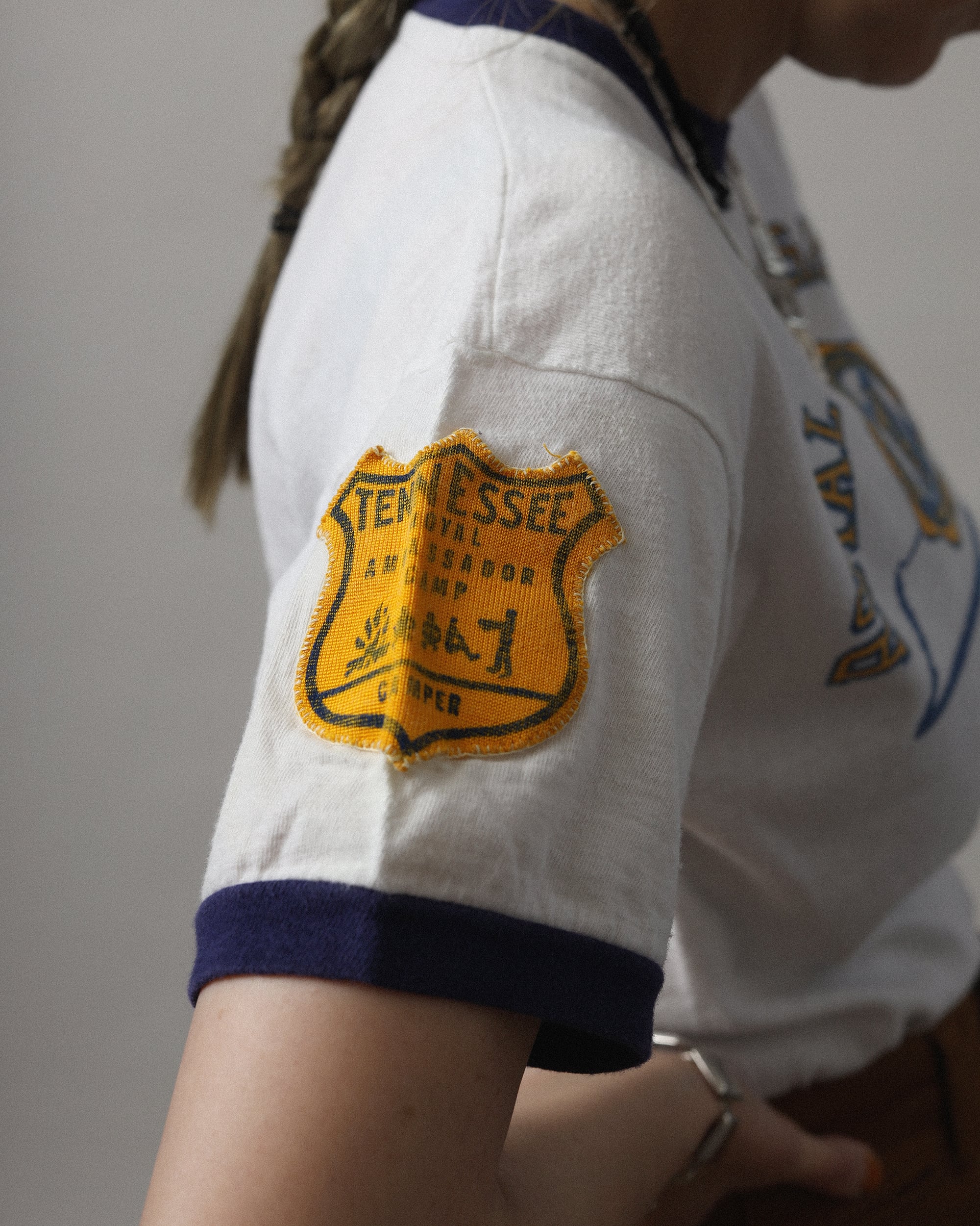 Era : c. 1970 Label : Champion / Made in USA Materials : Cotton Condition : 裾にリペアあと, 腰に小さいヨゴレ Color : White Size : 肩幅44cm / 身幅45cm / 着丈53cm / 袖丈16cm *採寸は平置きで採寸しております。多少の誤差は御了承下さい。 Model:156cm Care : 手洗い, 洗濯機クリーニングモード