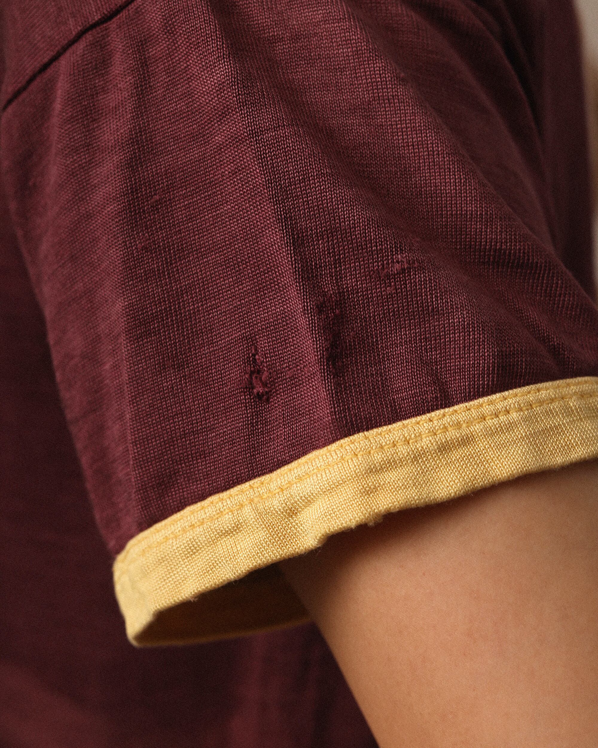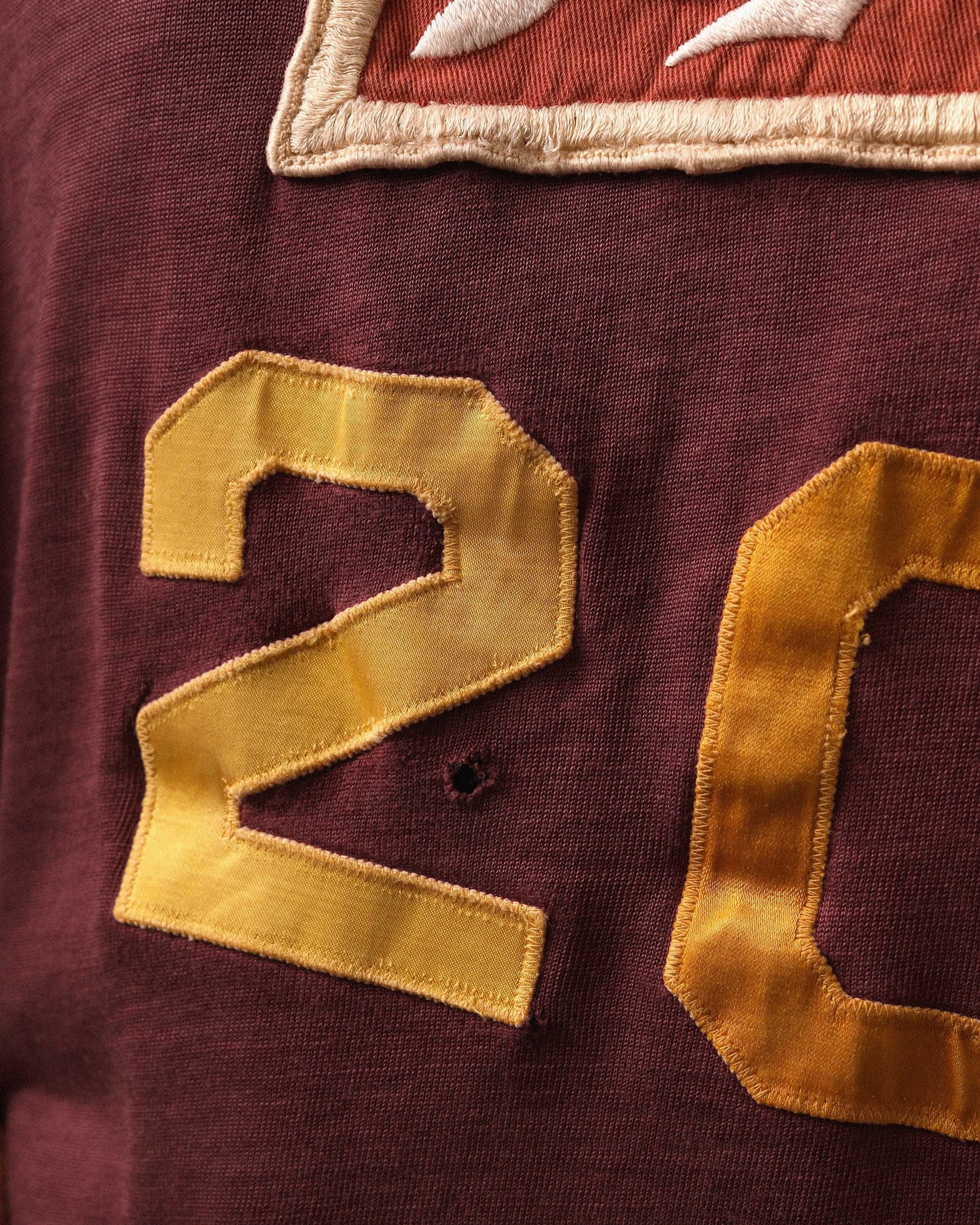 Era : c. 1960 Label : Empire / Made in --- Materials : おそらくCotton, Nylon Condition : 全体的にダメージ, フェード Color : Faded Burgundy Size : 肩幅47cm / 身幅46cm / 着丈57cm / 袖丈12cm *採寸は平置きで採寸しております。多少の誤差は御了承下さい。 Model:163cm Care : 手洗い, 洗濯機クリーニングモード