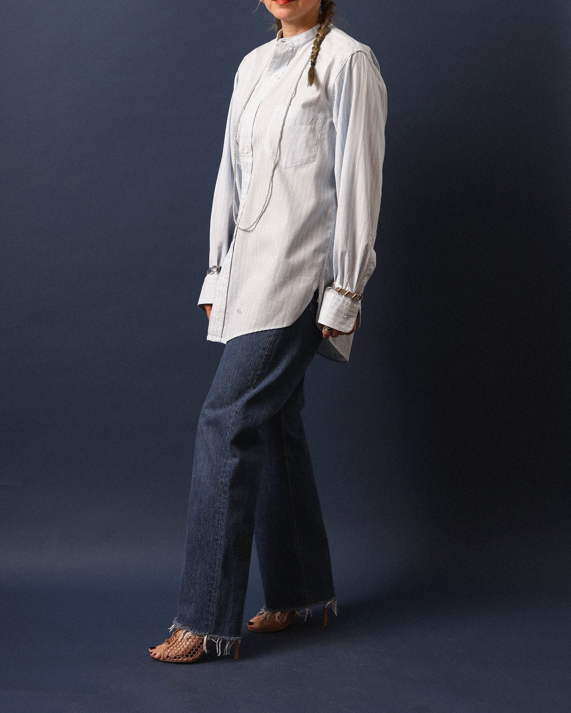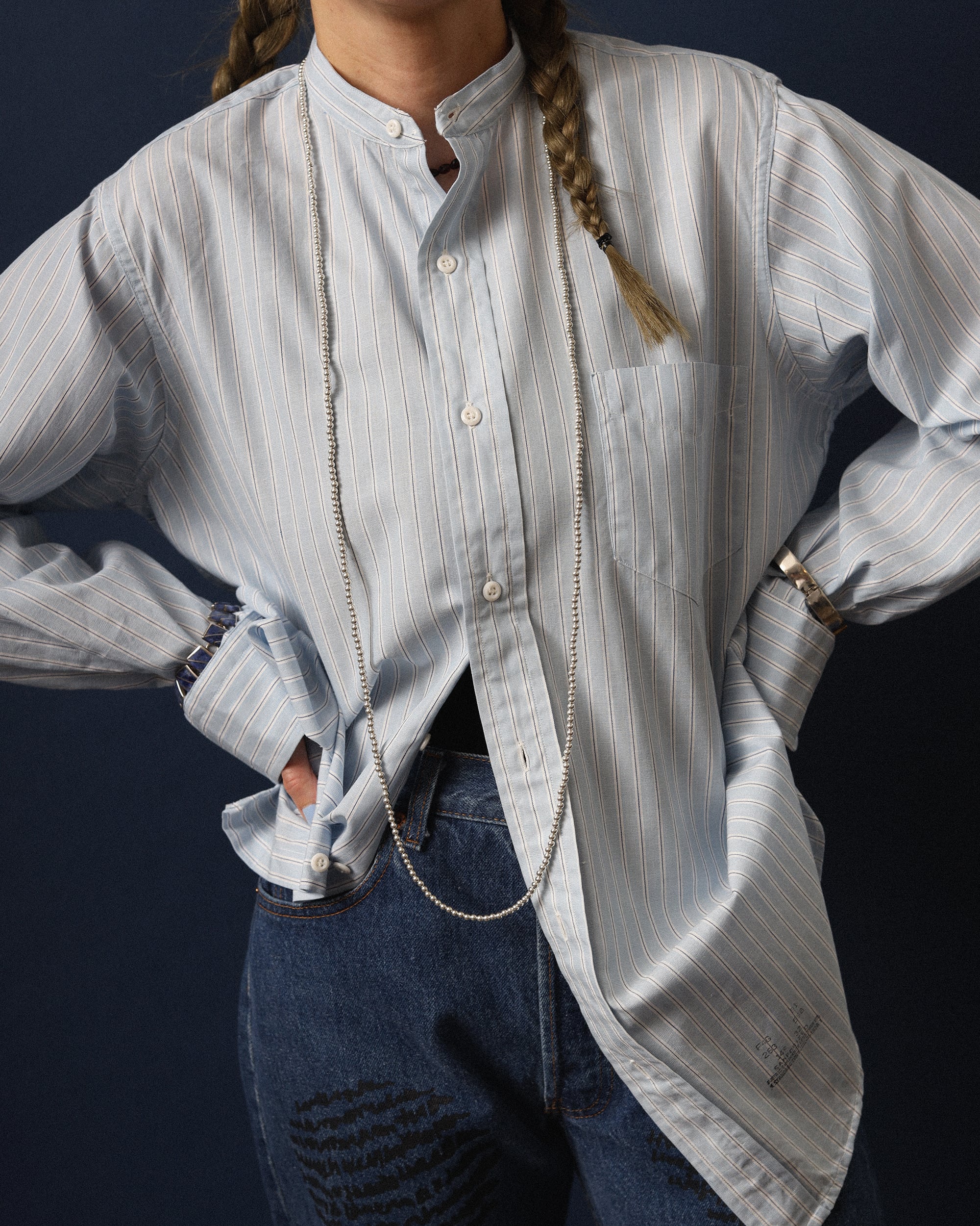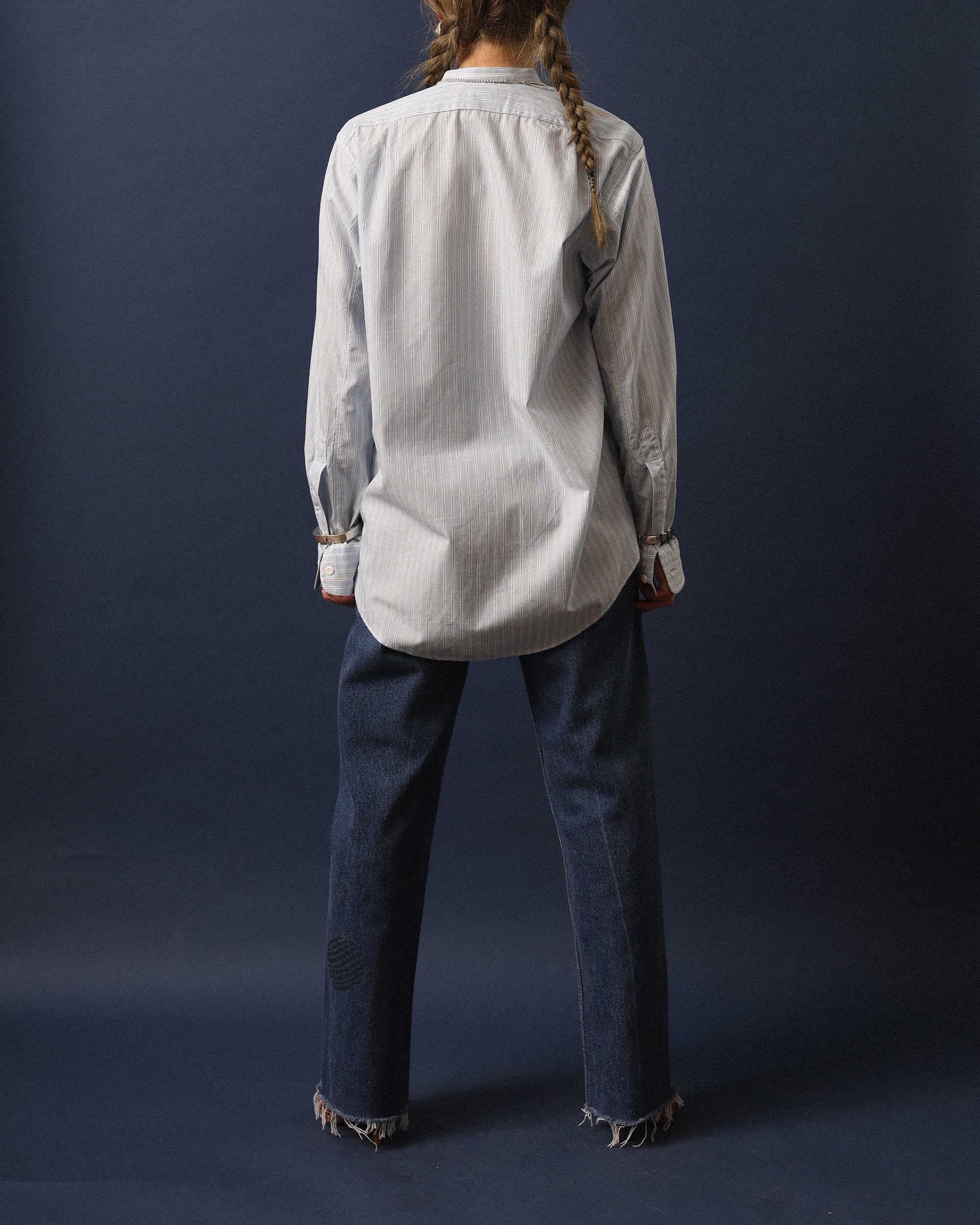 Era : c.1940-50 Label : Long Wear / Made in USA Materials : Cotton Condition : 目立ったキズやシミなし, 台襟リペア Color : Blue, White Size : 肩幅42cm / 身幅54cm / 着丈77cm / 袖丈59cm *採寸は平置きで採寸しております。多少の誤差は御了承下さい。 Model:156cm Care : ドライクリーニング