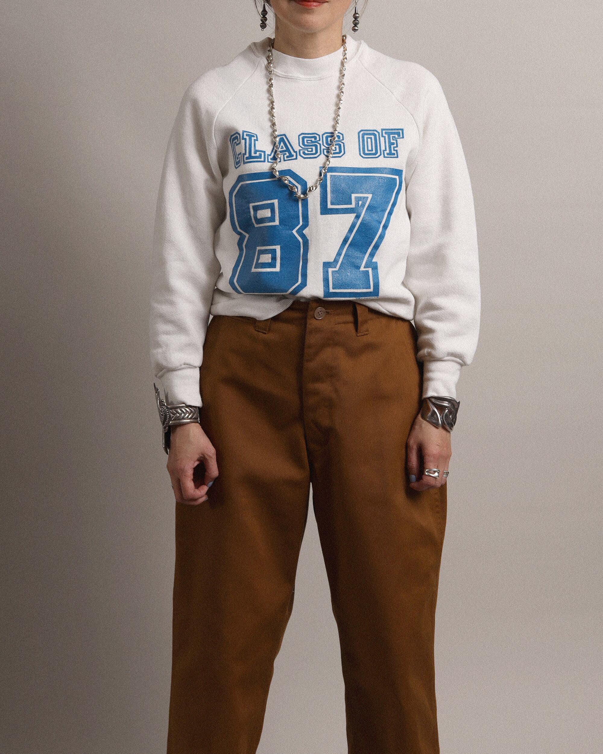Era : c.1980 Label : Jerzees / Made in USA Materials : Cotton, Poly Condition : 首元に目立たないキズ Color : White Size : 肩幅ラグラン / 身幅45cm / 着丈52cm / 裄丈73cm *採寸は平置きで採寸しております。多少の誤差は御了承下さい。 Model:156cm Care : 洗濯機クリーニングモード、手洗い