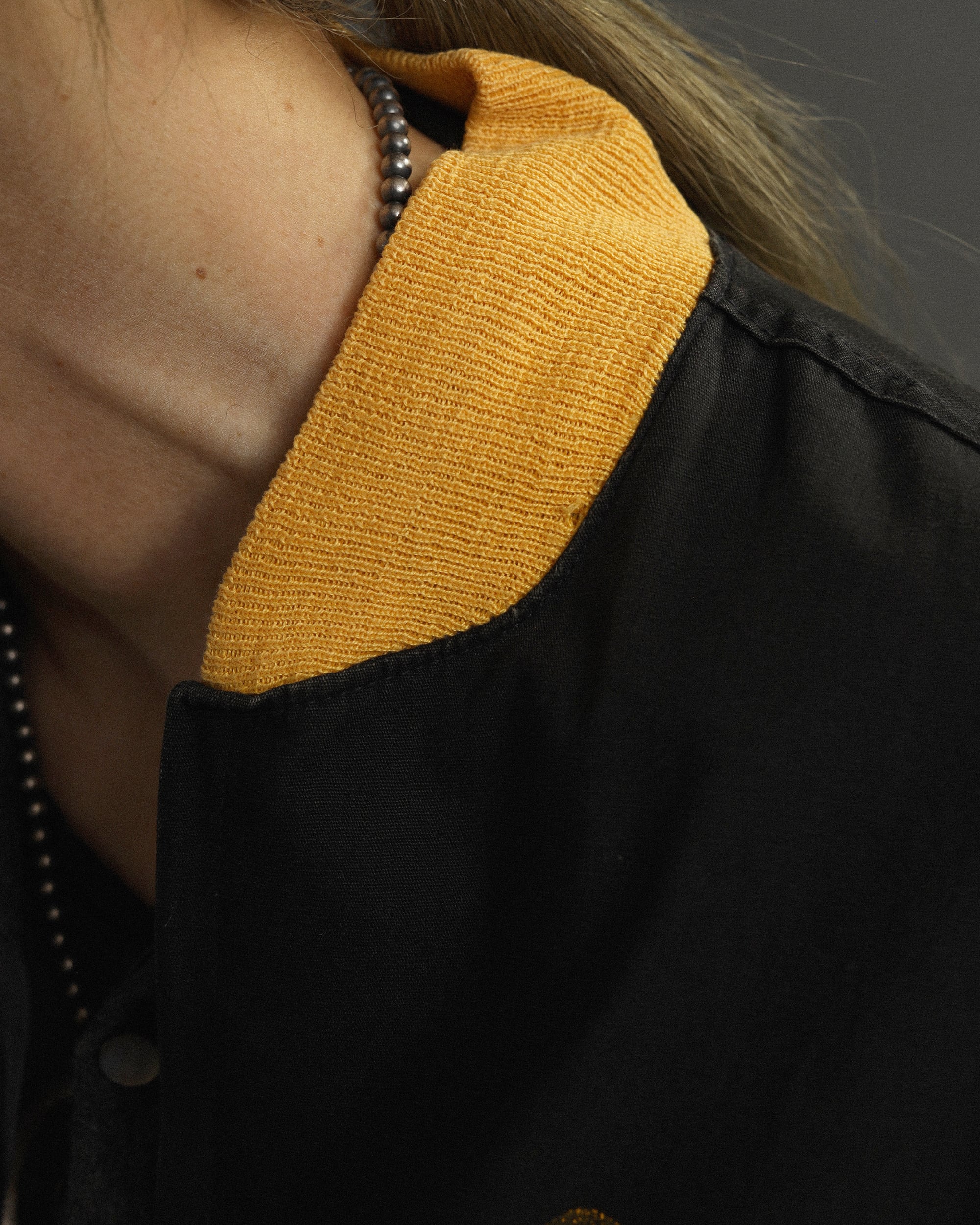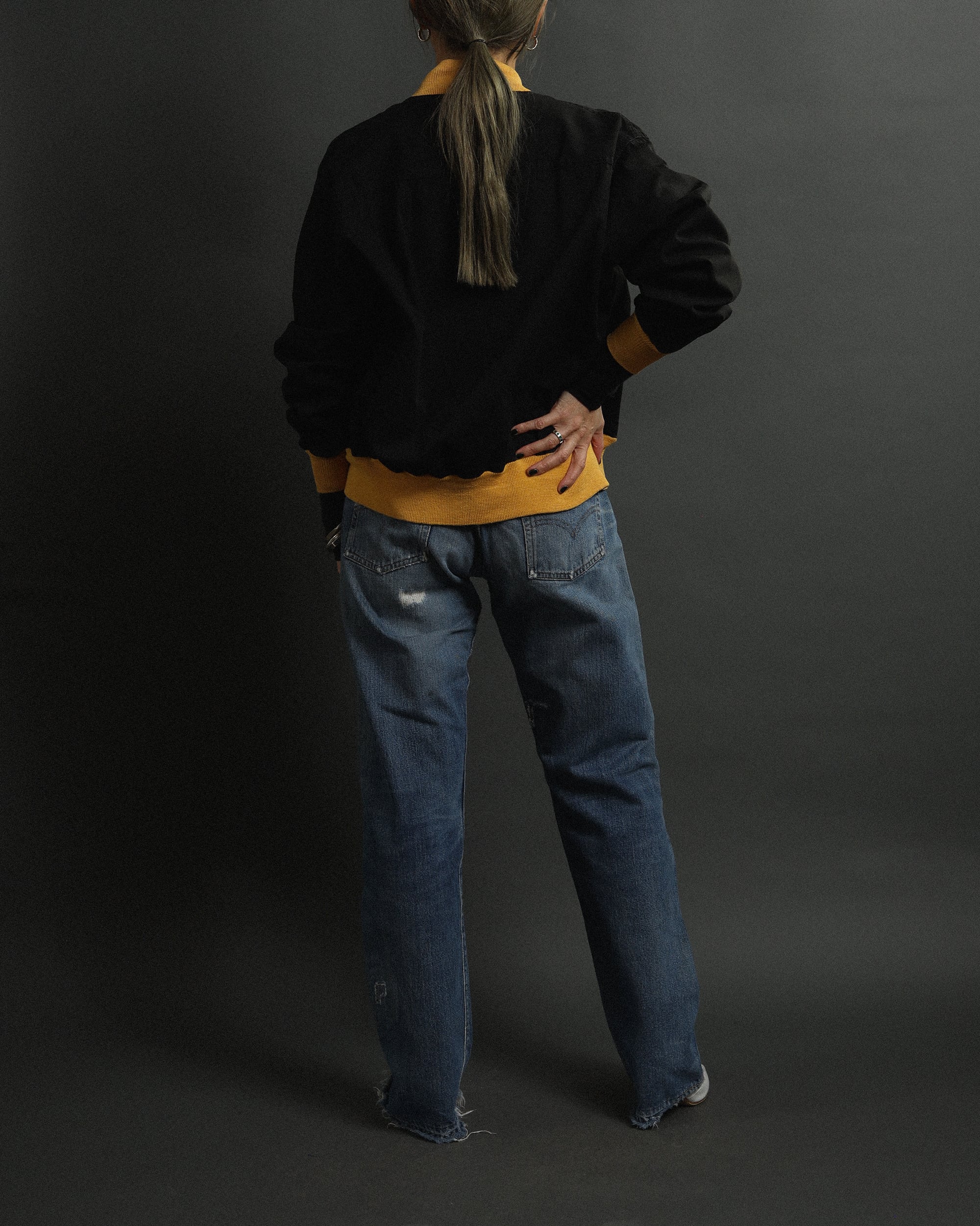 Era : c.1960 Label : Missing / Made in --- Materials : Cotton, Other Condition : リブ部分キズ, ダメージ Color : Faded Black Size : 肩幅47cm / 身幅56cm / 着丈57cm / 袖丈58cm *採寸は平置きで採寸しております。多少の誤差は御了承下さい。 Model:156cm Care : 洗濯機クリーニングモード、手洗い