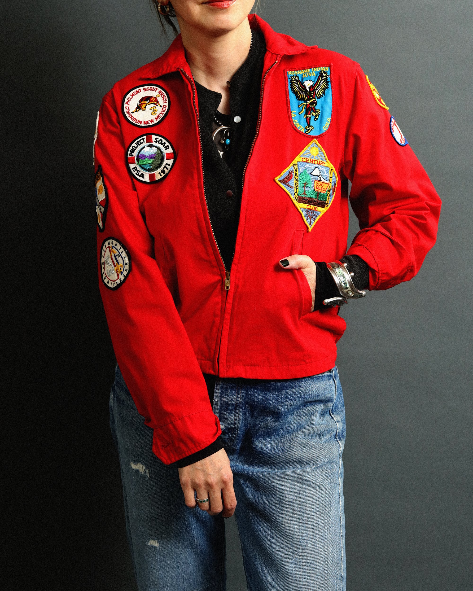 Era : c.1960 Label : Boy Scouts Of America / Made in --- Materials : Cotton, Other Condition : 目立ったキズやシミなし Color : Red Size : 肩幅41cm / 身幅47cm / 着丈56cm / 袖丈56cm *採寸は平置きで採寸しております。多少の誤差は御了承下さい。 Model:156cm Care : 色落ちの可能性がある為単品手洗い