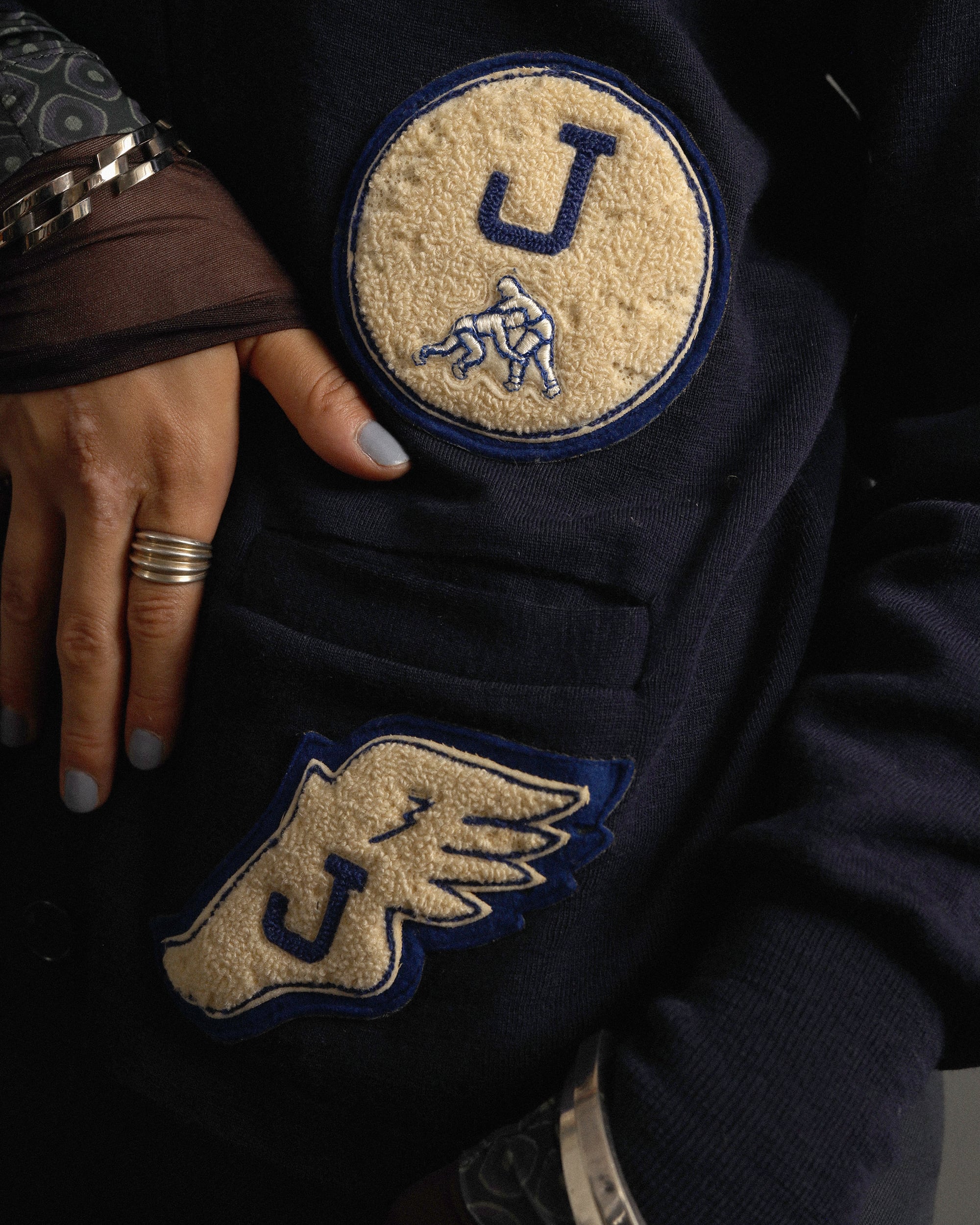 Era : c.1960 Label : Superlastic / Made in --- Materials : Wool Condition : ワッペンにダメージ Color : Navy Size : 肩幅43cm / 身幅50cm / 着丈60cm / 袖丈56cm *採寸は平置きで採寸しております。多少の誤差は御了承下さい。 Model:163cm Care : クリーニング