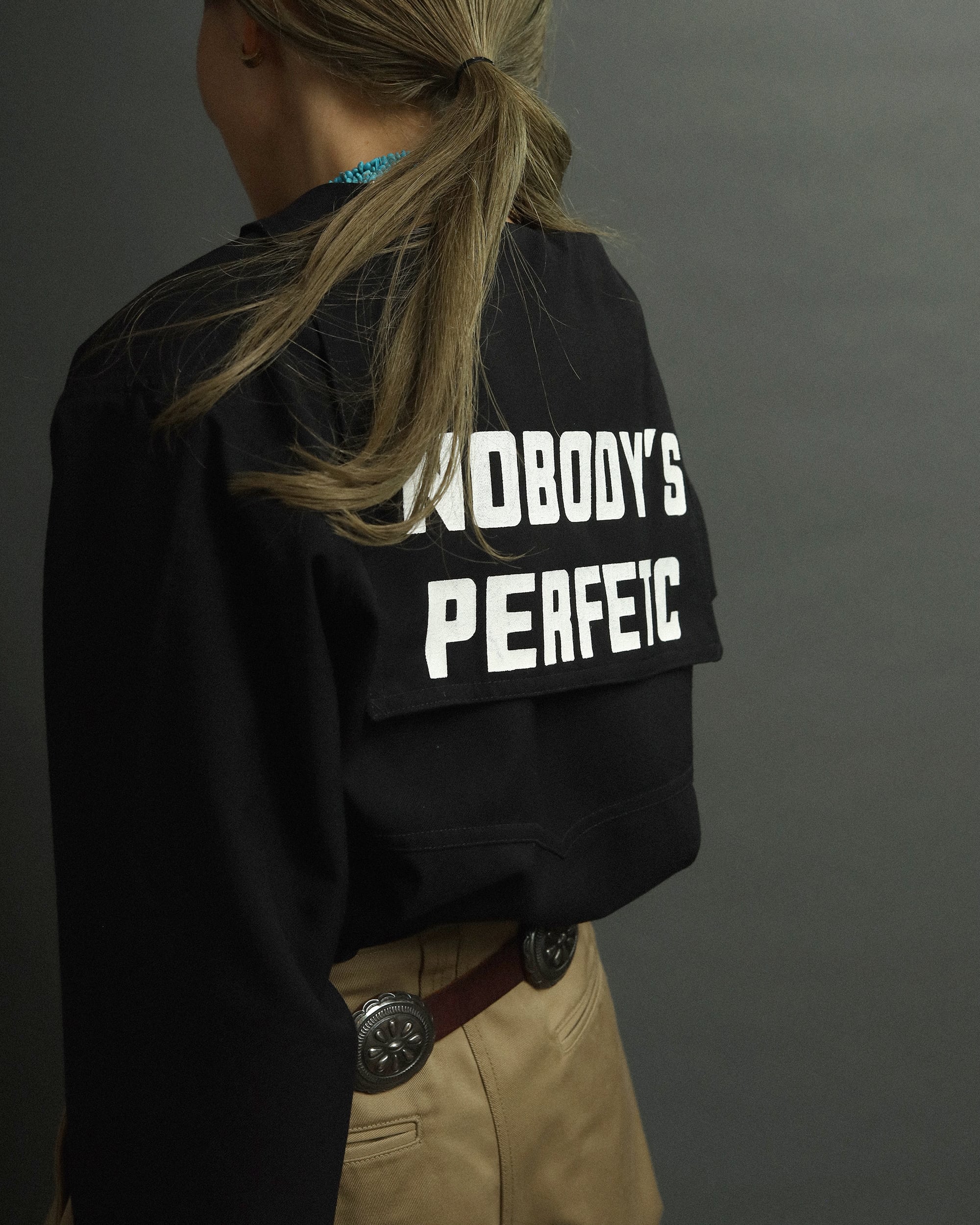 左の胸ポケットや前身頃からバックスタイルまでウエスタンヨーク調の切り返し、セーラー型なのに同色の糸での憎いデザイン。