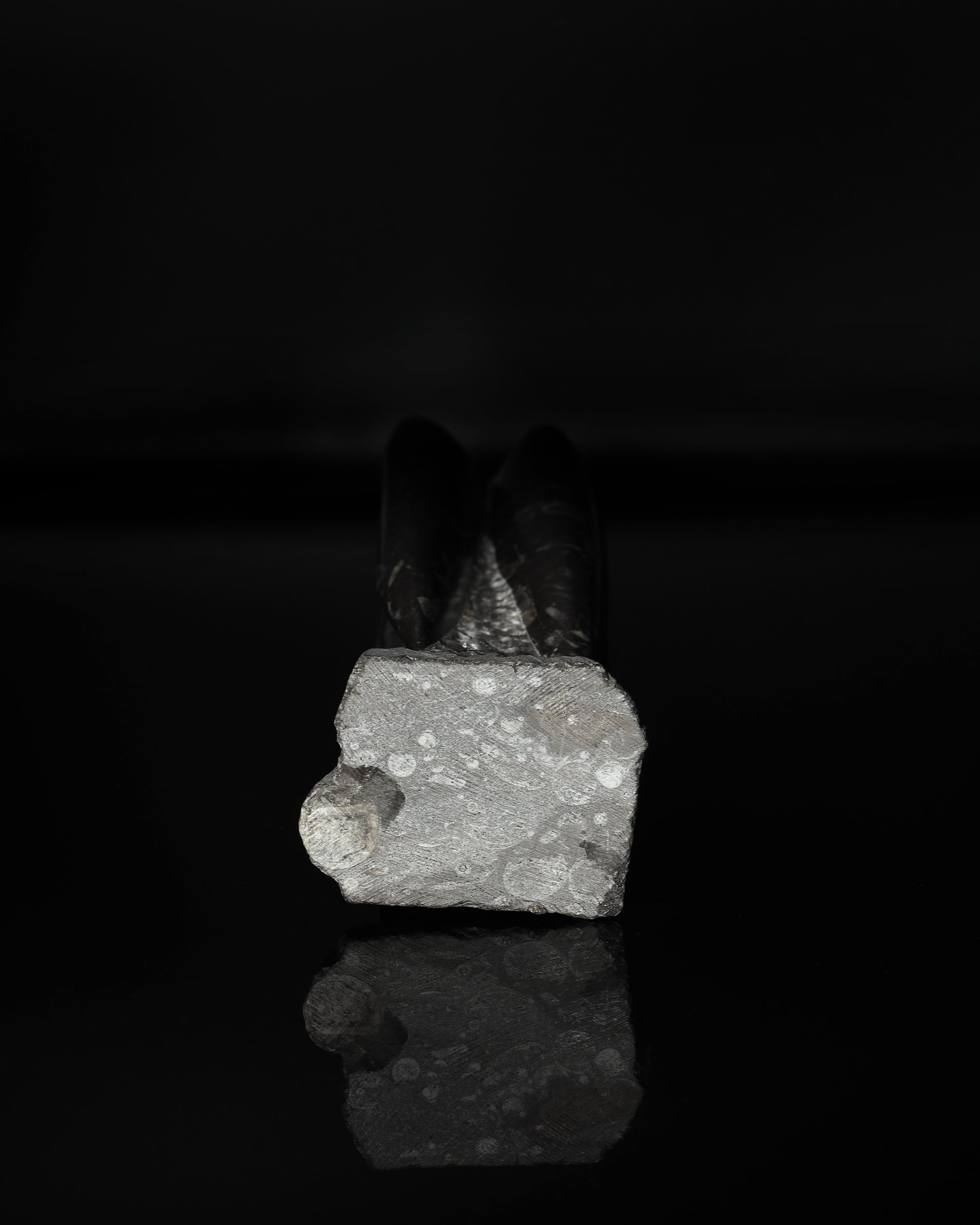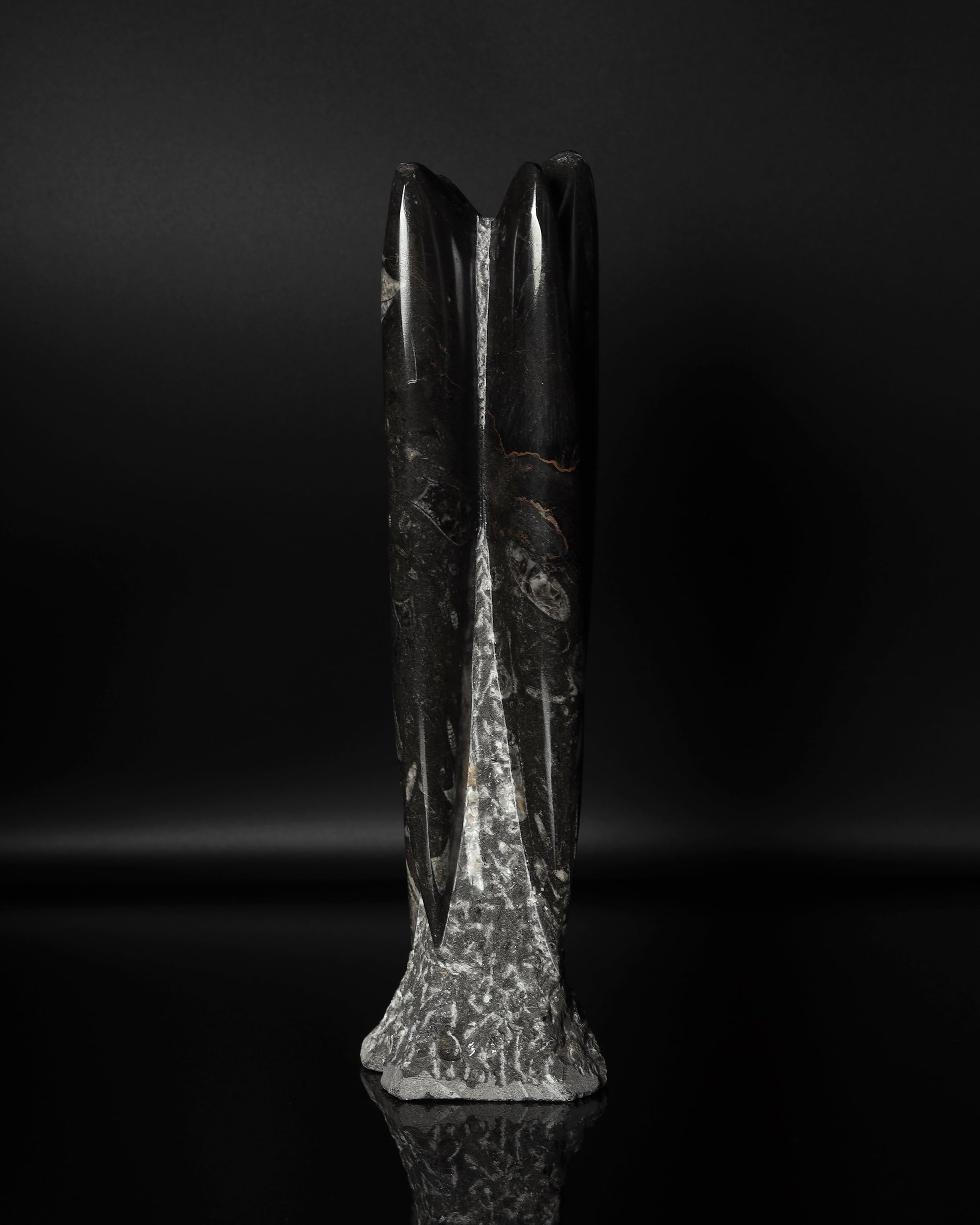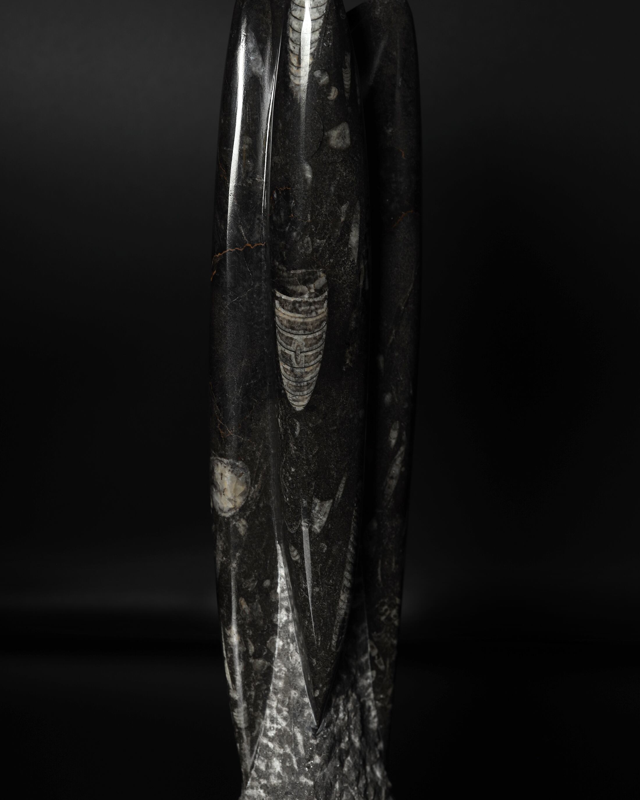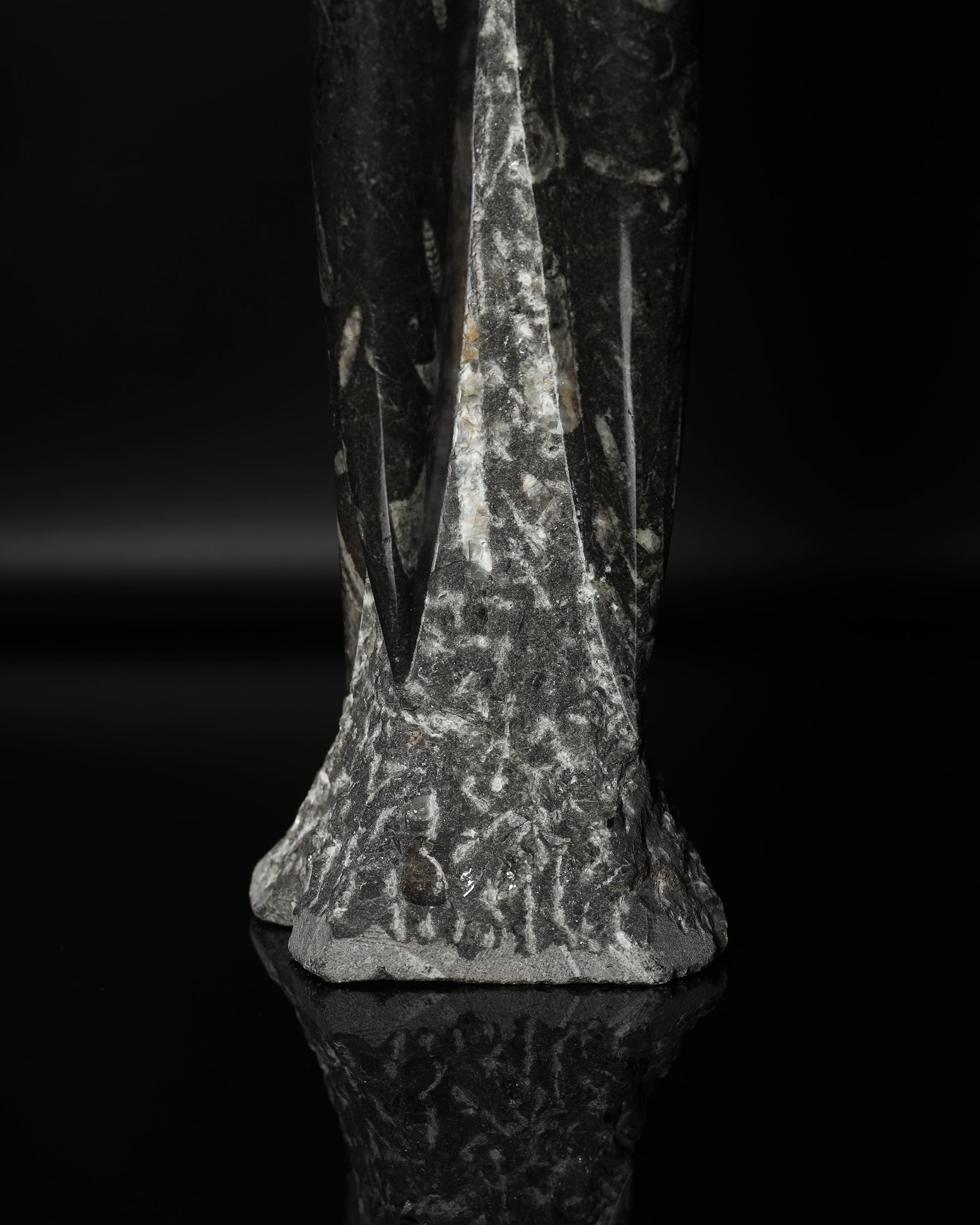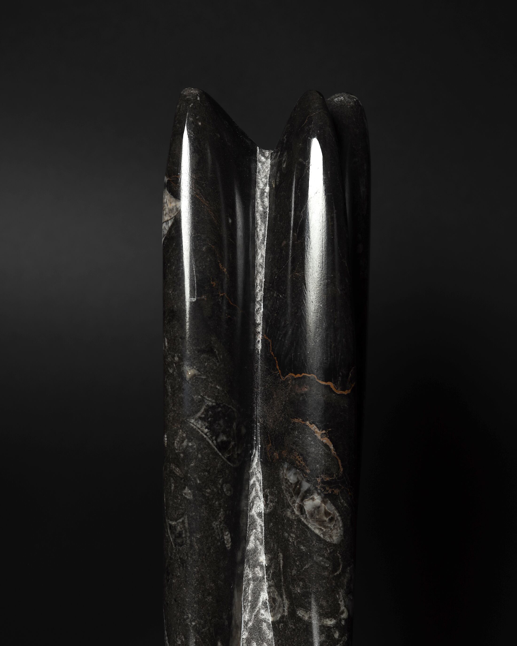 太古の海を泳いでいたオルソセラスの殻の痕跡が、大理石の中に自然の模様として静かに封じ込められたタワーオブジェクト。