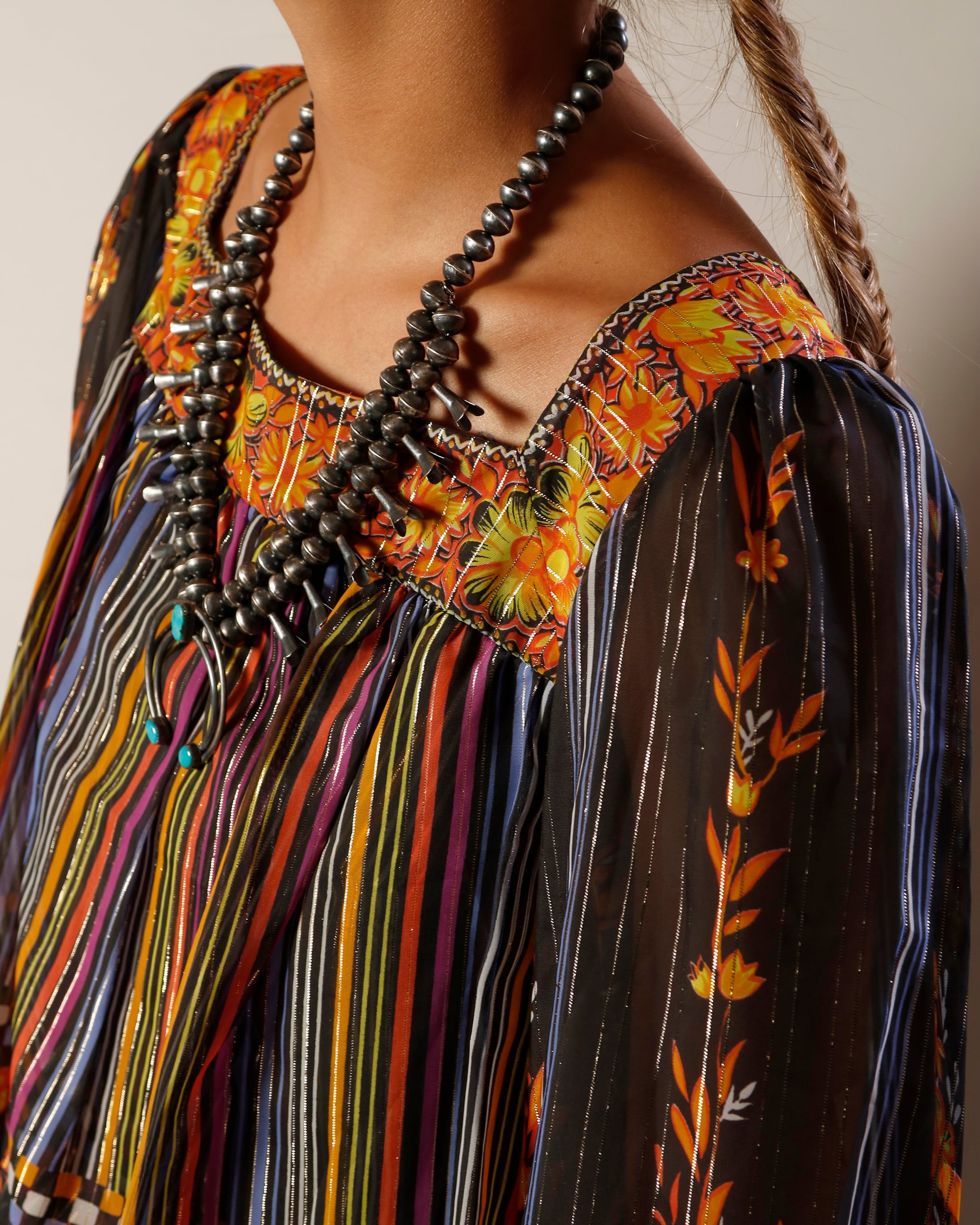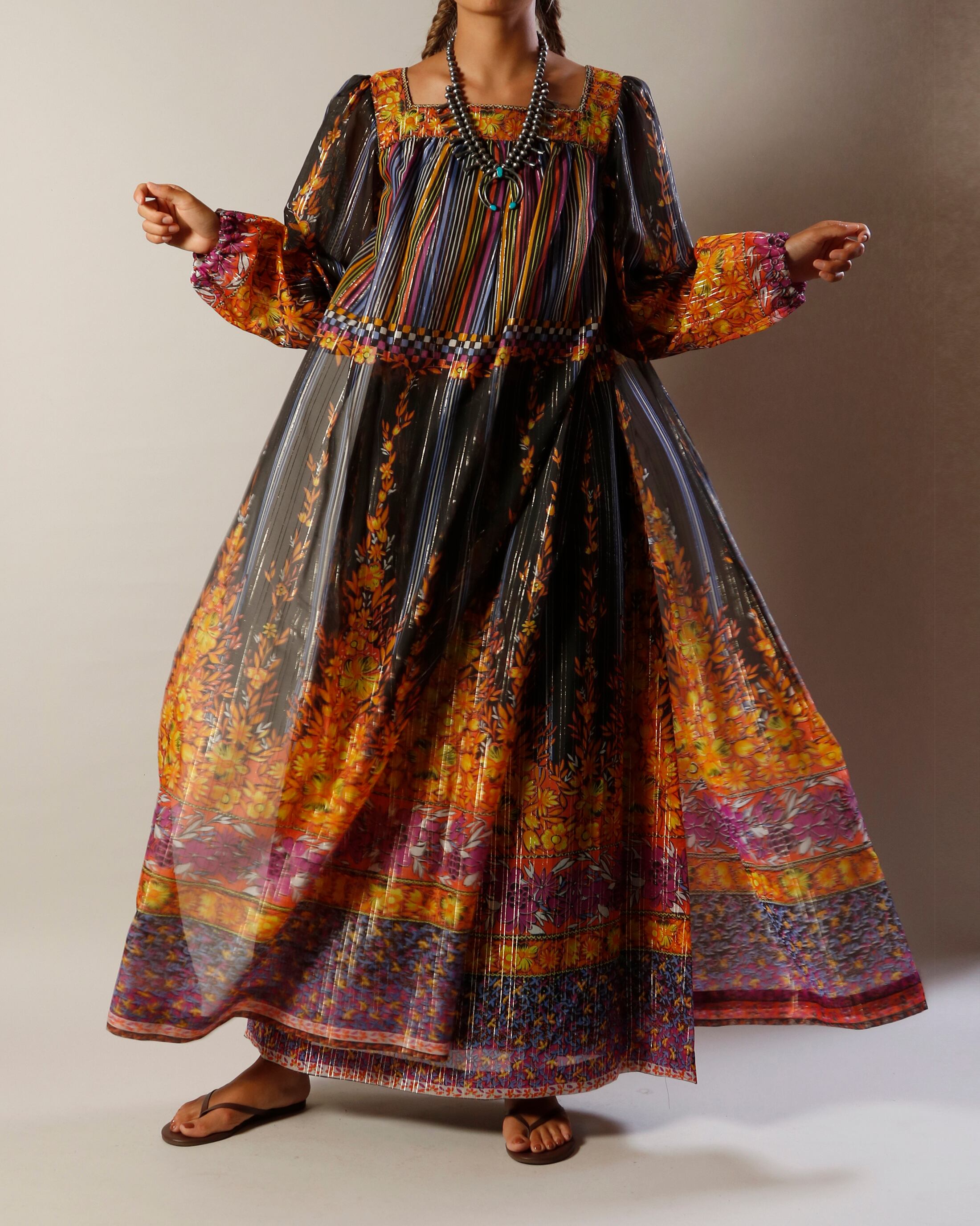 二枚仕立てになっており、かなりの布の分量を使用しているドレス。ブラックカラーがベースなので花柄ですがシックな印象です。
