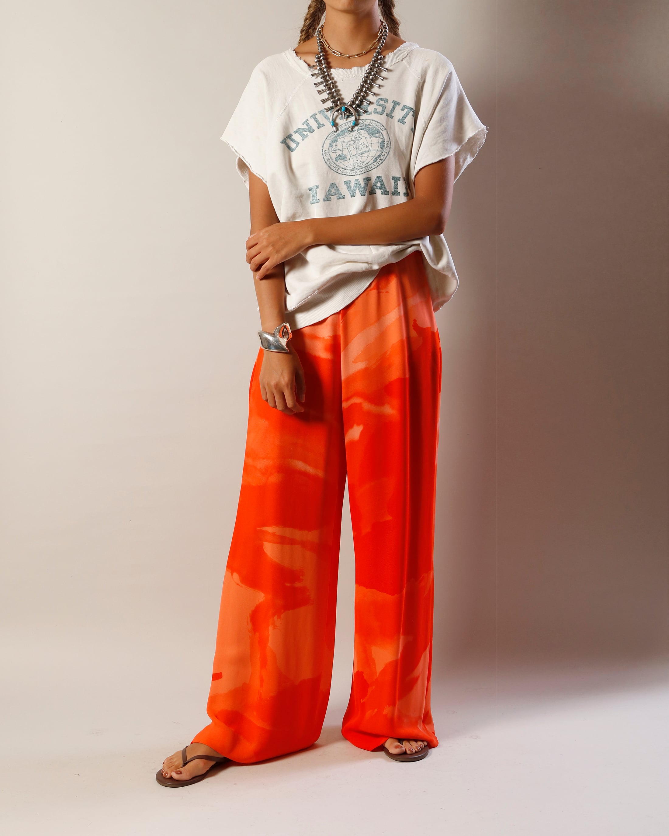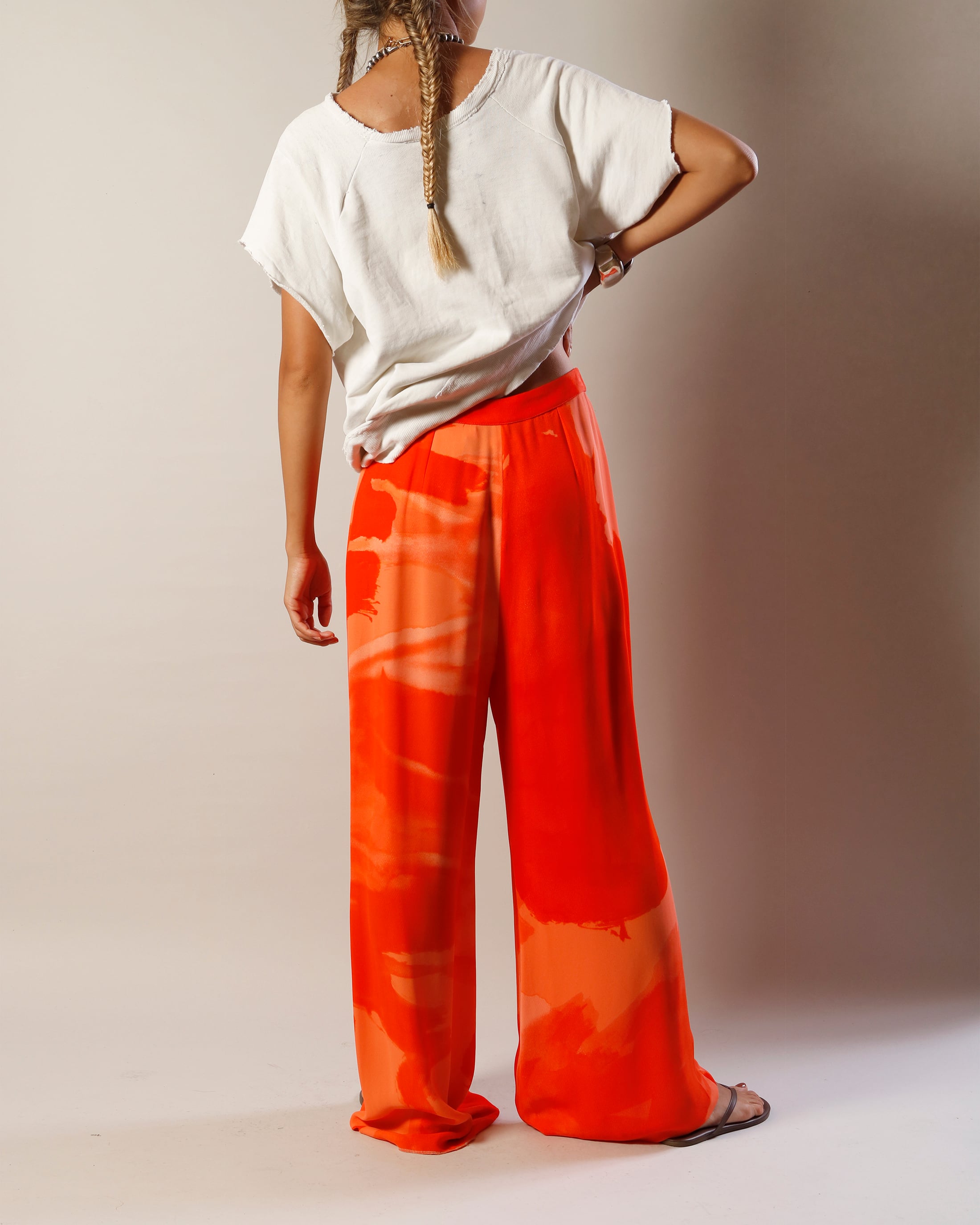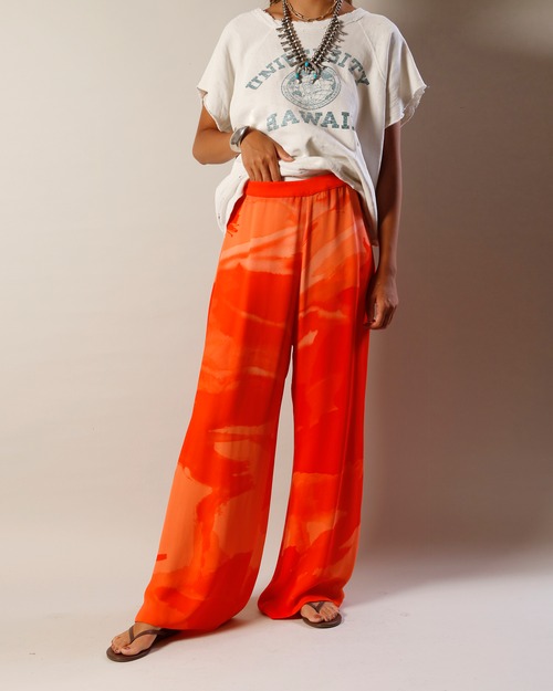 股上深めのイージーパンツ、ビビットなマーブルカラーが目を引きます。