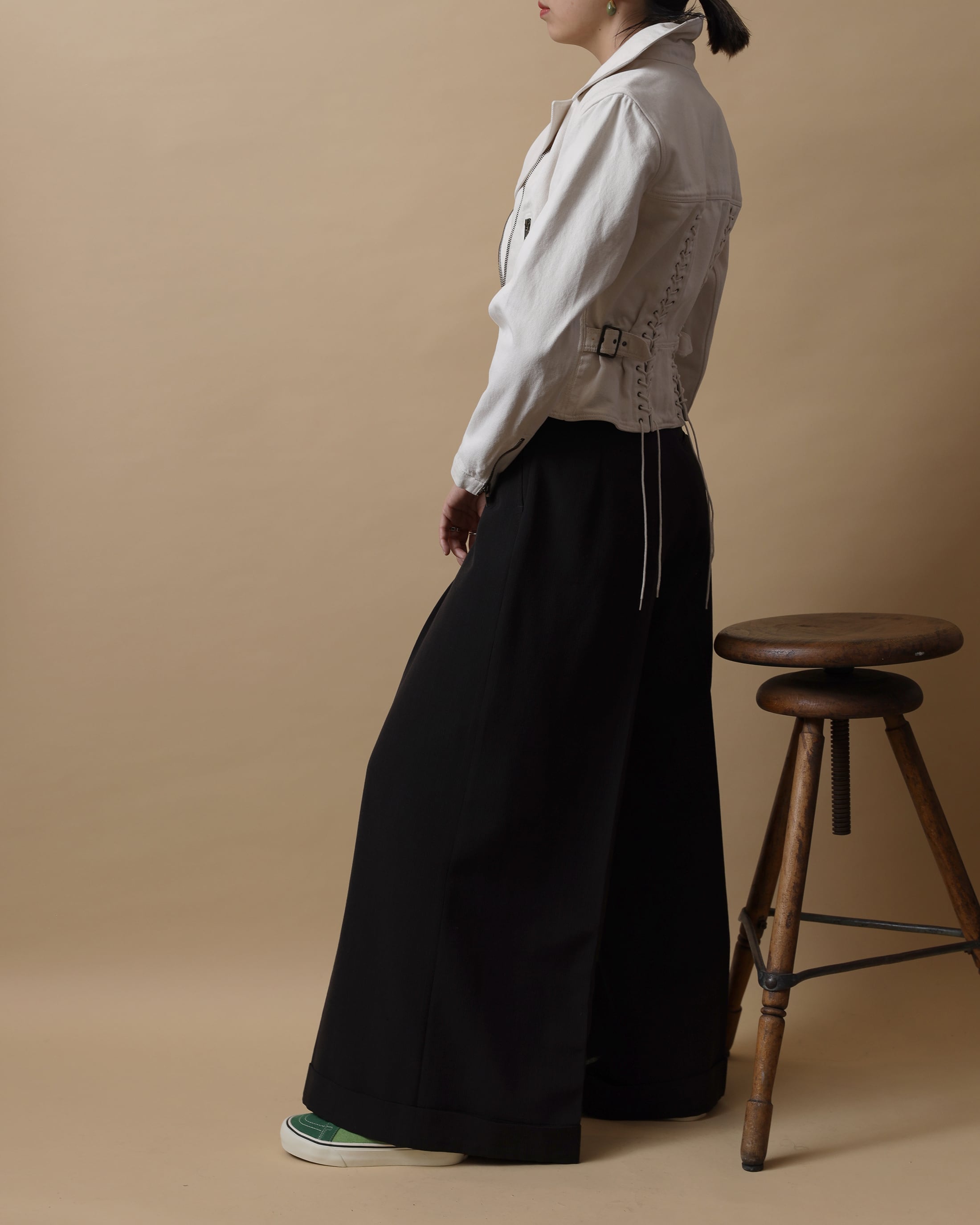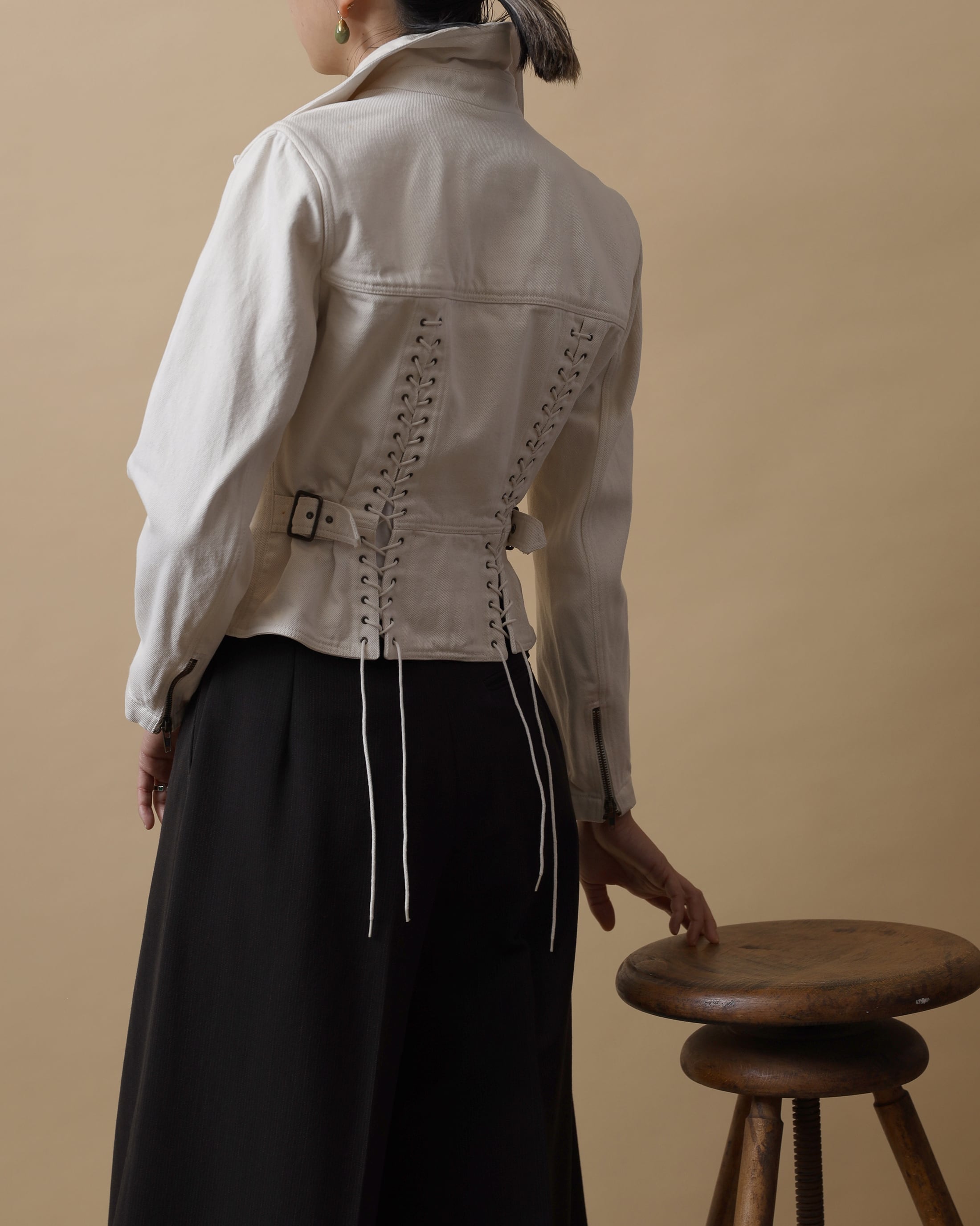 後ろの二列のレースアップが特徴のライダースジャケット。着丈が短めなのでマキシ丈のボトムやワイドパンツに好相性。