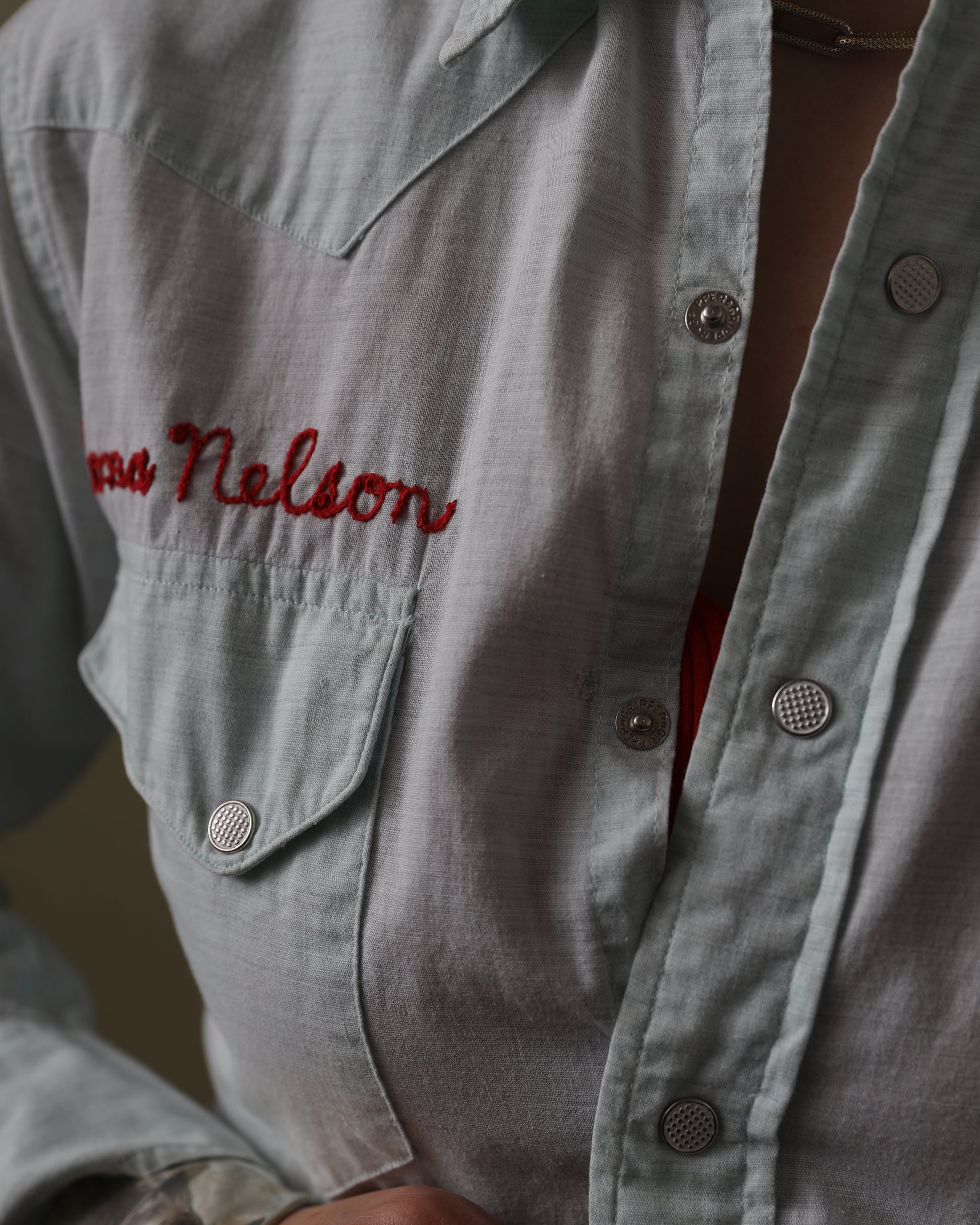 Era : c.1950 Label : Lee - Rider Shirt / Made In USA Materials : Cotton, Other Condition : 第3ボタン横にキズ、右脇にヨゴレ Color : Light Blue, Red Size M : 肩幅42cm / 身幅46cm / 着丈76cm / 袖丈60cm *採寸は平置きで採寸しております。多少の誤差は御了承下さい。 Care : 手洗い Model : 170cm