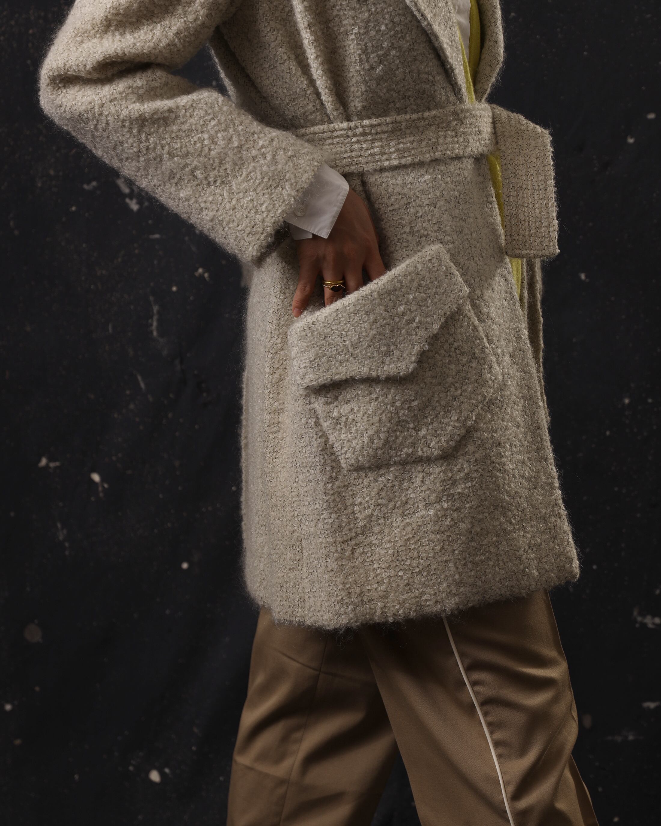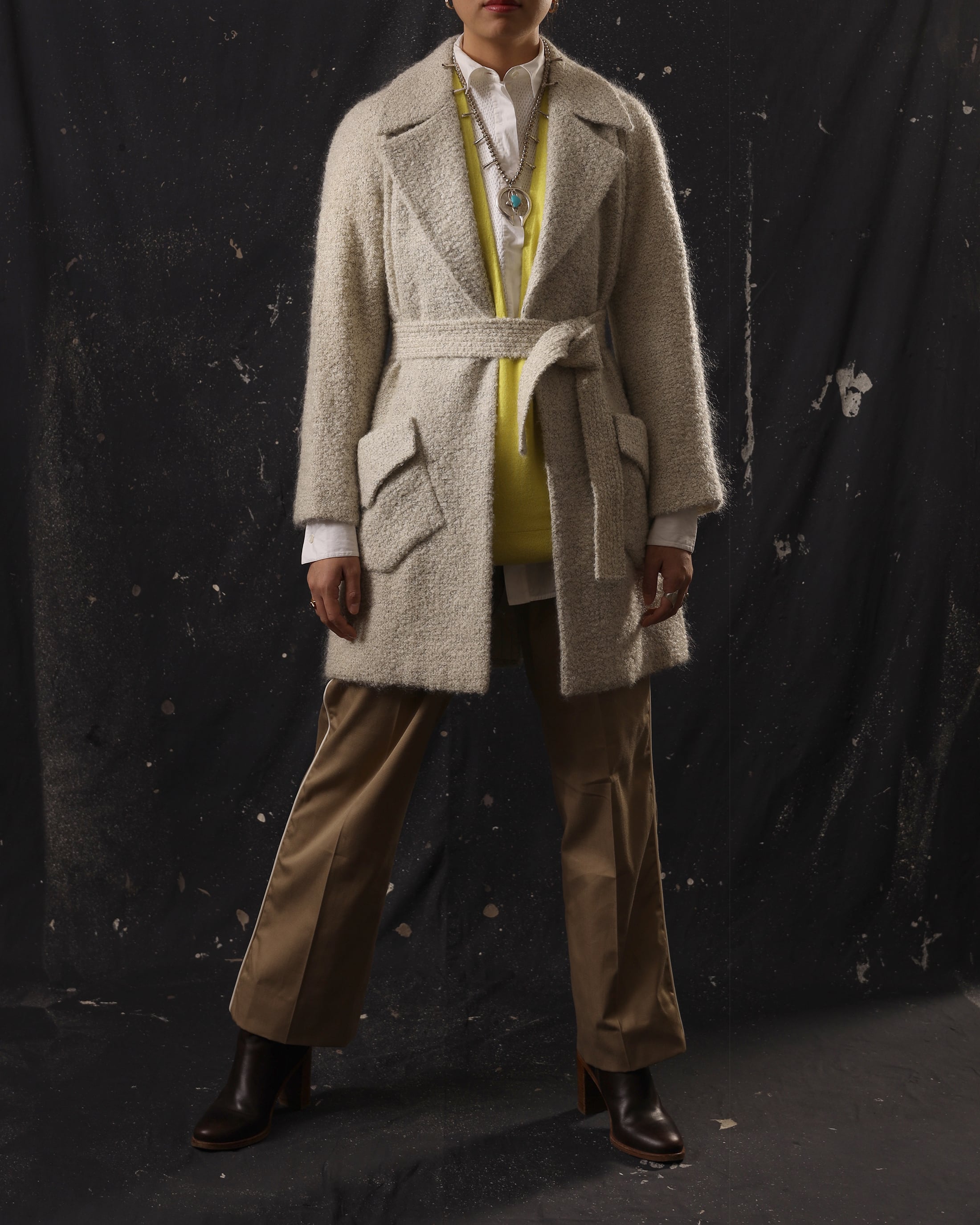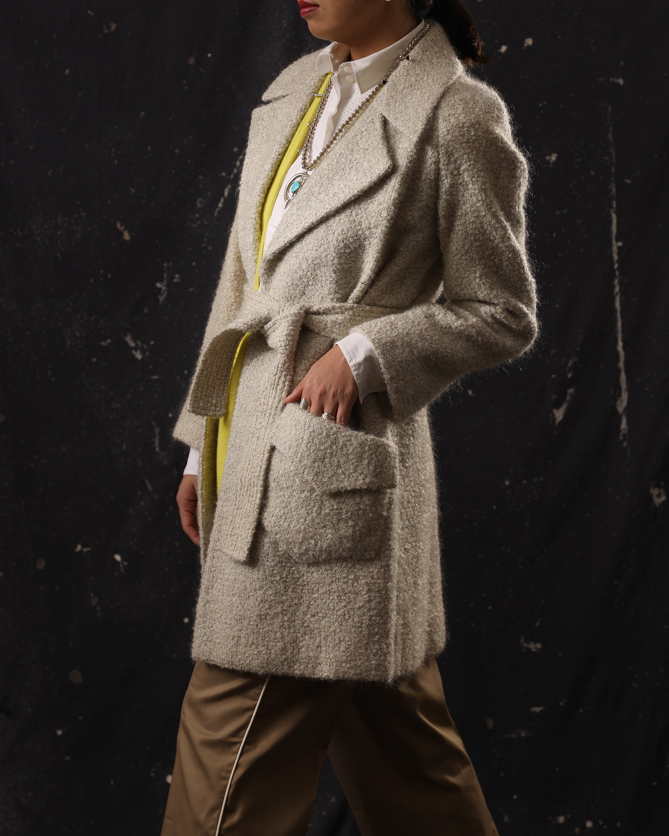 Era : c.1980-1990 Label : Bill Blass / Made in USA Materials : おそらくWool,Mohair,Other Condition : 目立った傷やシミなし Color : White Size : 身幅48cm / 肩幅ラグラン / 着丈89cm / 裄丈77cm *採寸は平置きで採寸しております。多少の誤差は御了承下さい。 Model:170cm Care : クリーニング