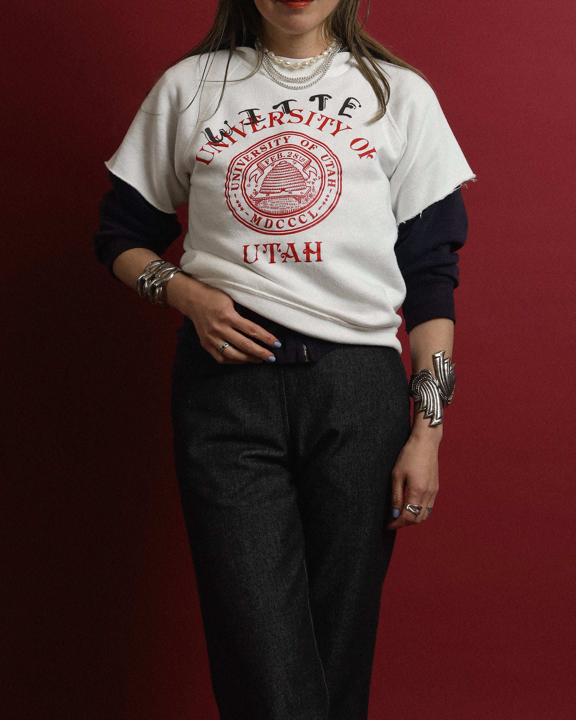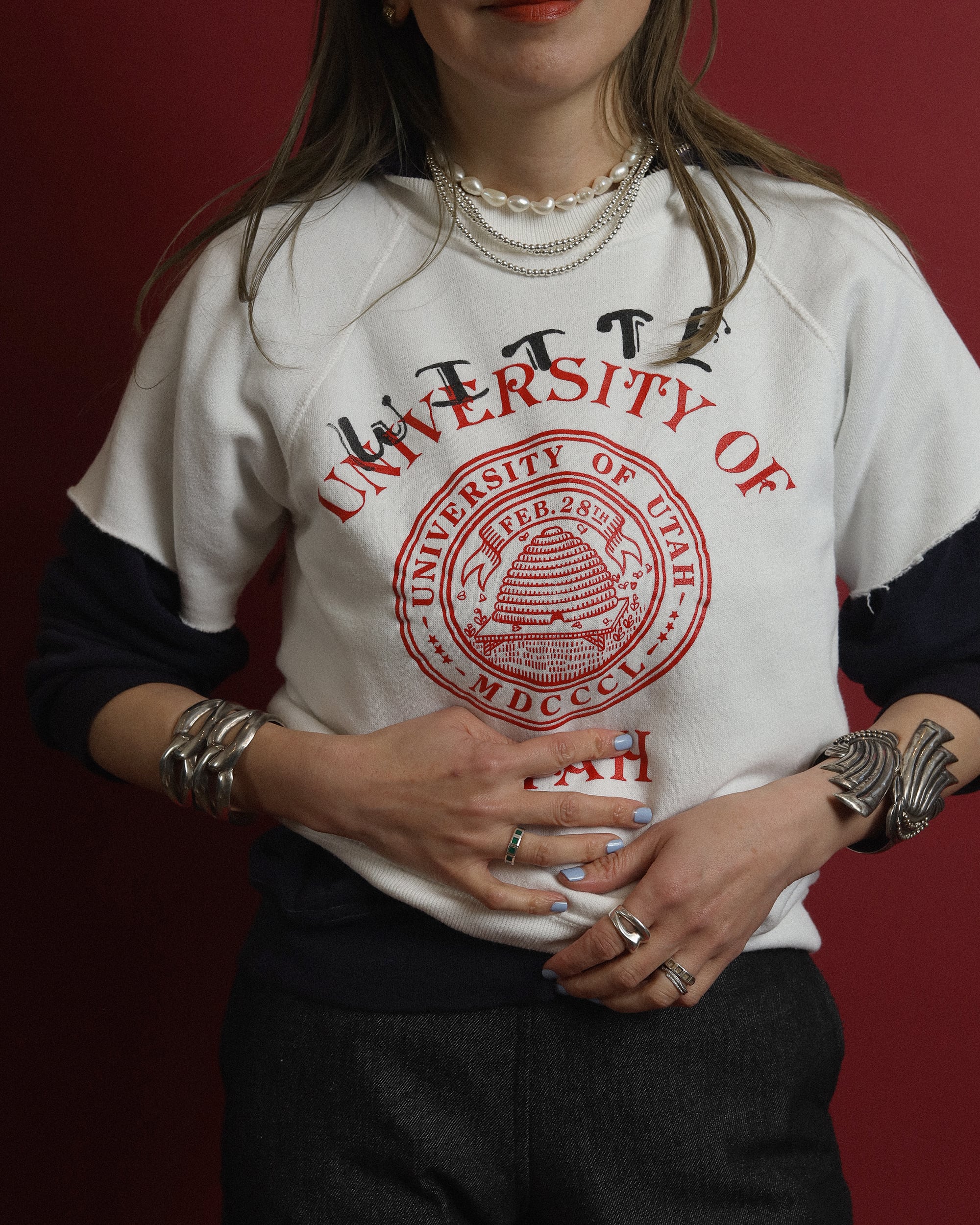 1950年代ヴィンテージTシャツに残されていた手書きの “WITTE” をモチーフに、オリジナルプリントとしてヴィンテージスウェットに落とし込みました。