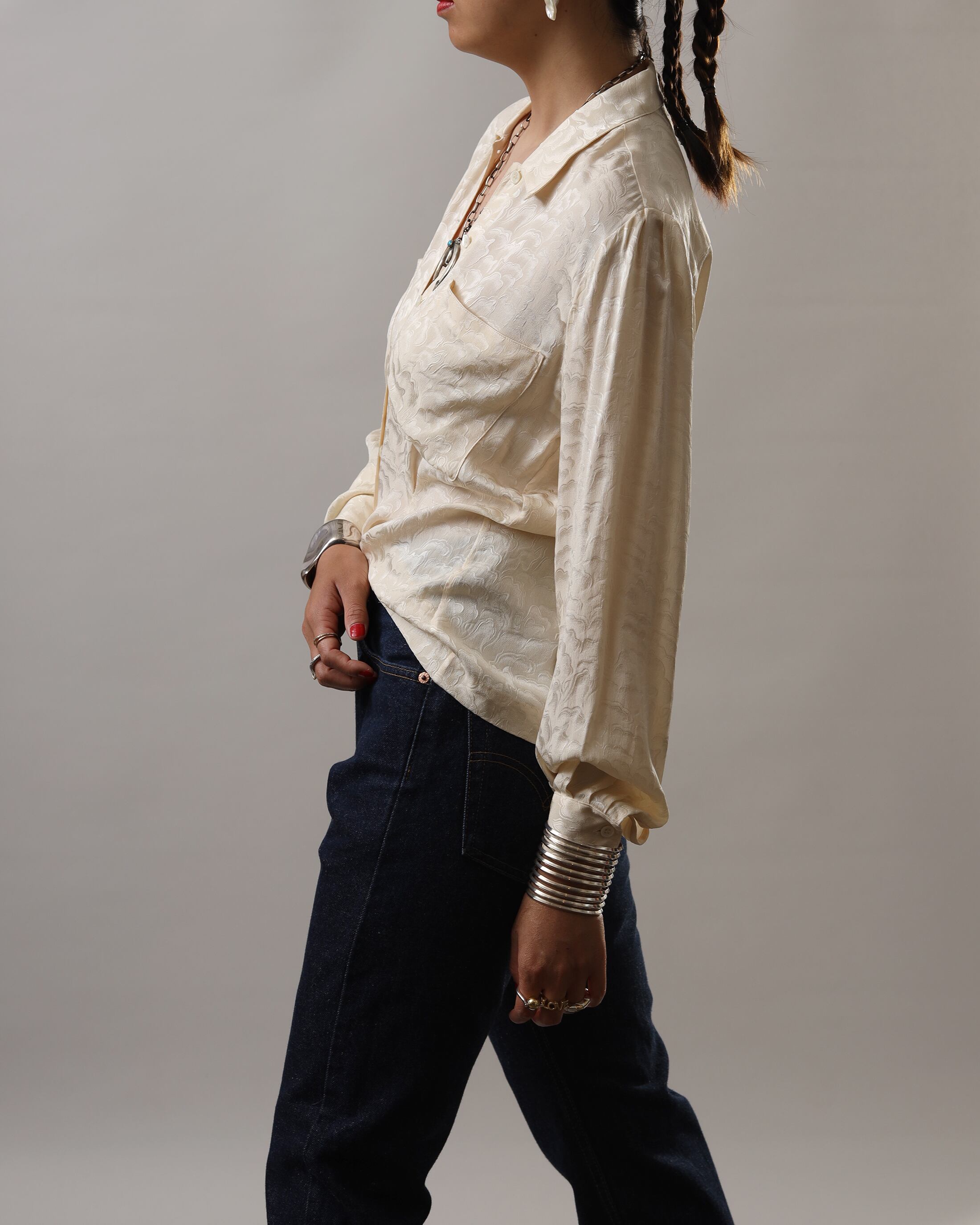 Era : c.1980 Label : Christian Dior / Made in --- Materials : おそらくSilk Condition : 前身頃右下, 左襟下に目立たないシミ Color : Ivory Size : 身幅48cm / 肩幅40cm / 着丈61cm / 袖丈59cm *採寸は平置きで採寸しております。多少の誤差は御了承下さい。 Model:170cm Care : ドライクリーニング