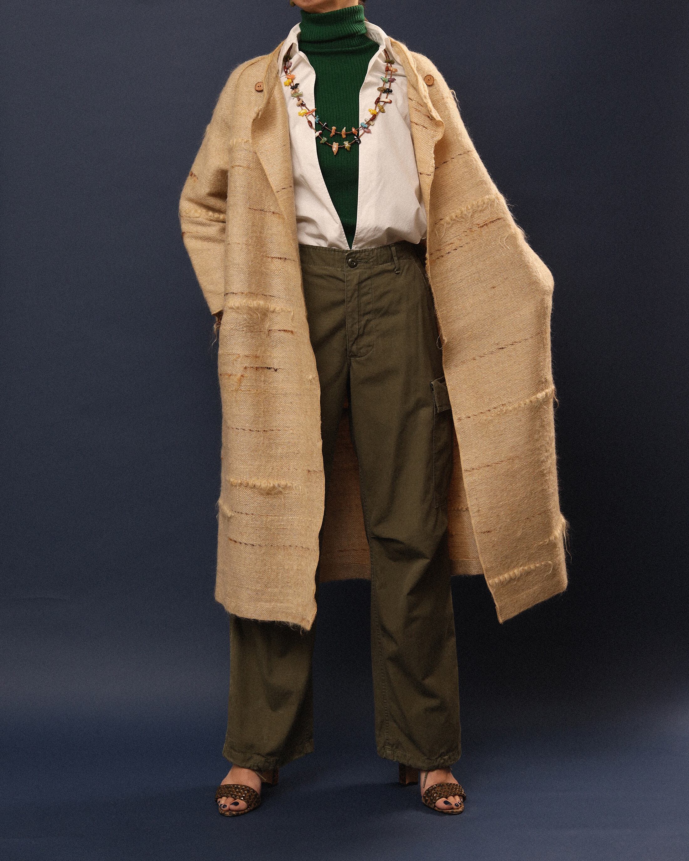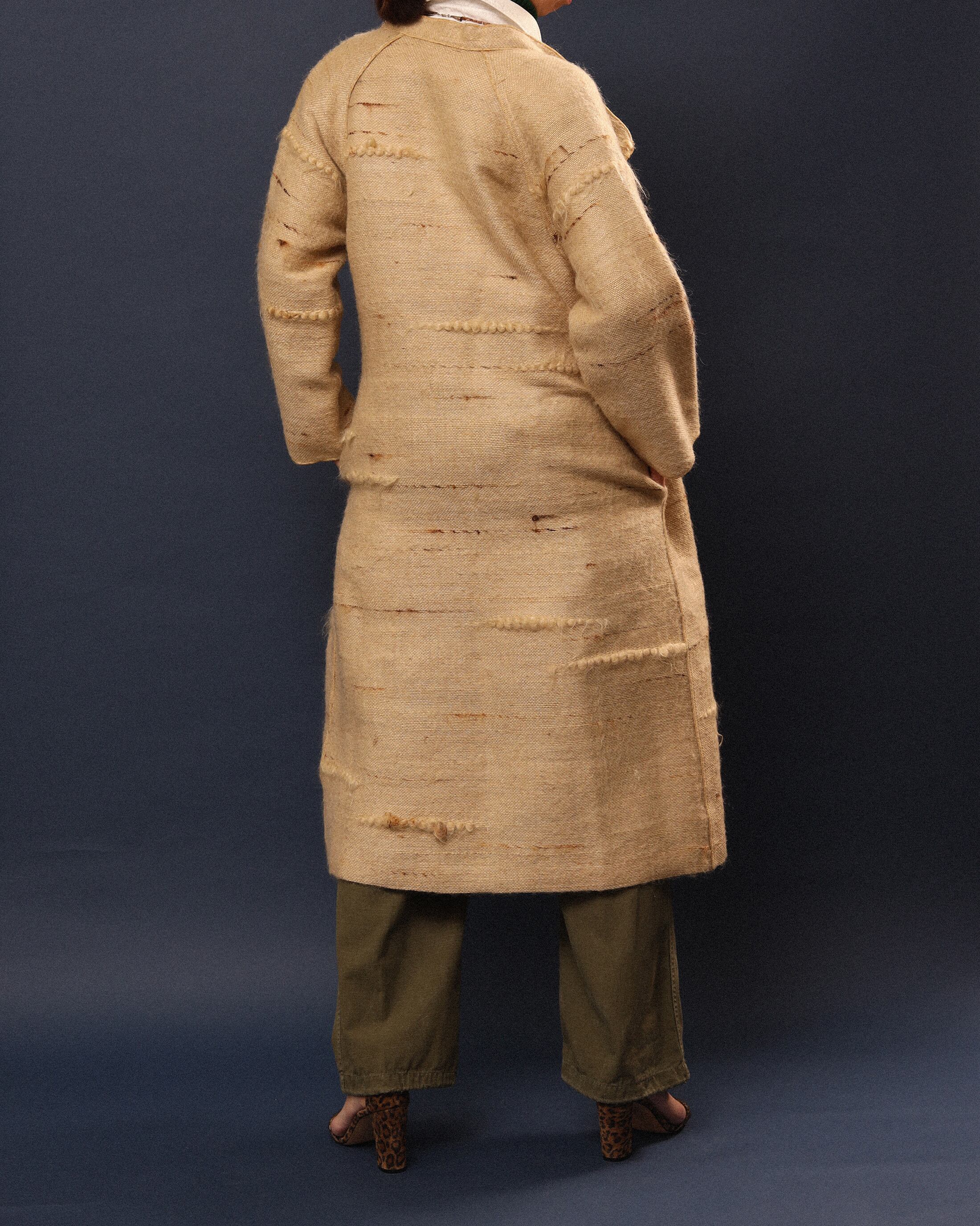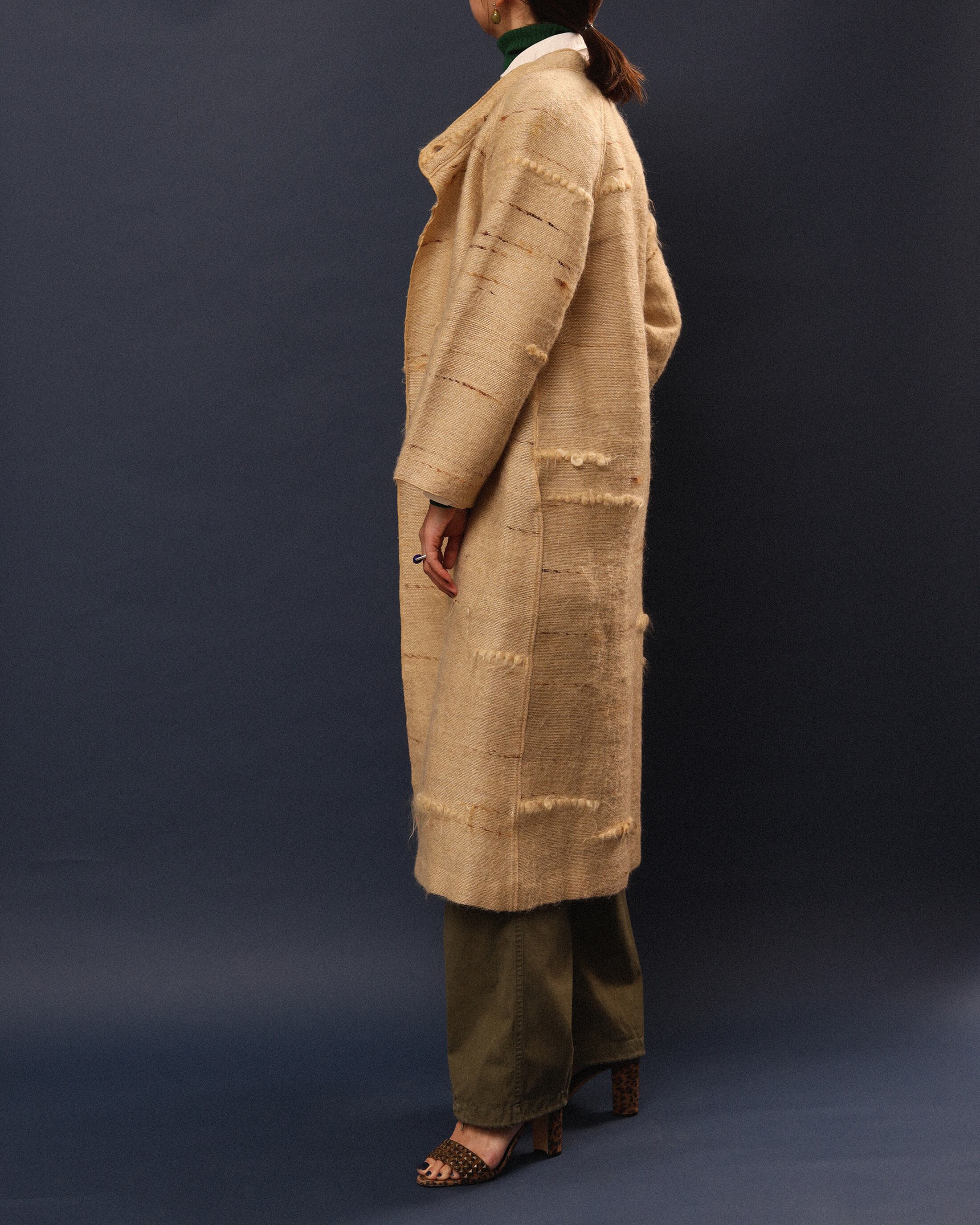 Era : c. 1990 Label : Geoffrey Beene / Made in --- Materials : おそらくWool, Silk, Other Condition : 左見頃端リペア Color : Beige Size : 肩幅ラグラン / 身幅55cm / 着丈111cm / 裄丈73cm *採寸は平置きで採寸しております。多少の誤差は御了承下さい。 Model:168cm Care : クリーニング