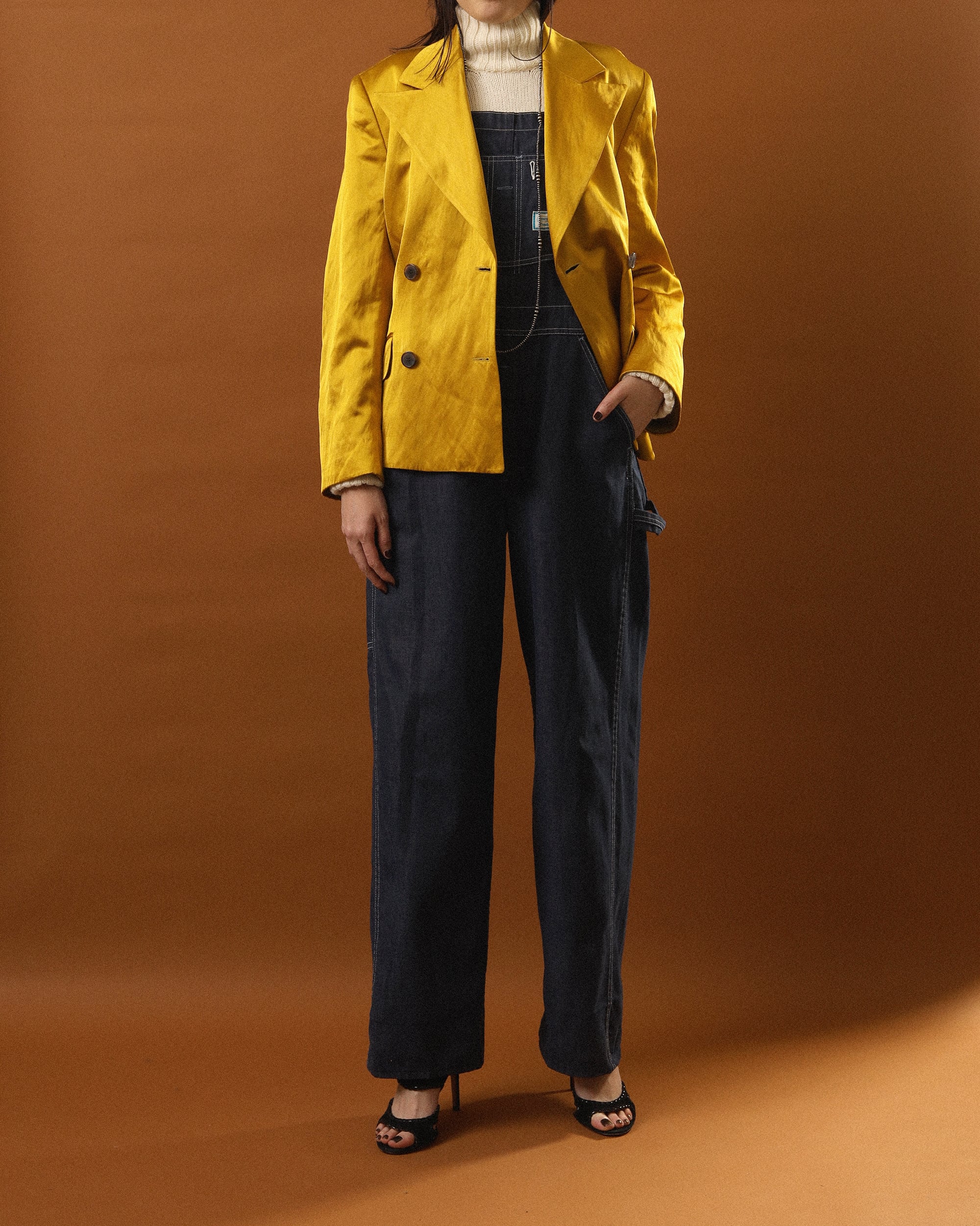 イエローゴールドのような鮮やかなカラーが特徴のベルト付きジャケット。薄手で3シーズン着用頂けます。フロントを開けて着る場合はベルトを後ろで留めて頂くとスッキリします。