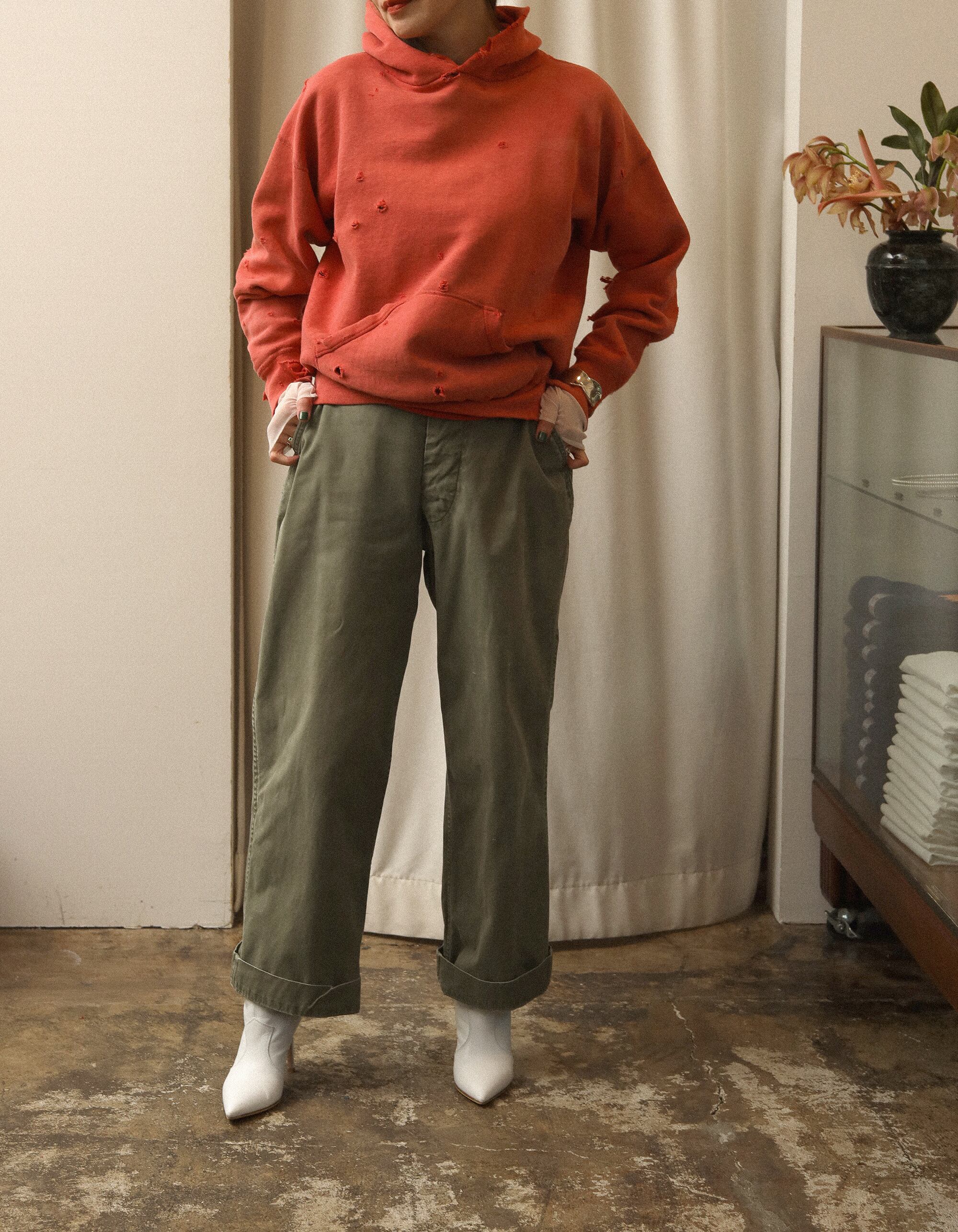 Era : c.1960 Label : Missing / Made in --- Materials : おそらくCotton Condition : 全体的にダメージ, ヤブレ, ヨゴレ Color : Faded Red Size : 肩幅60cm / 身幅55cm / 着丈60cm / 袖丈50cm *採寸は平置きで採寸しております。多少の誤差は御了承下さい。 Model:156cm Care : 色落ちの可能性がある為単品手洗い